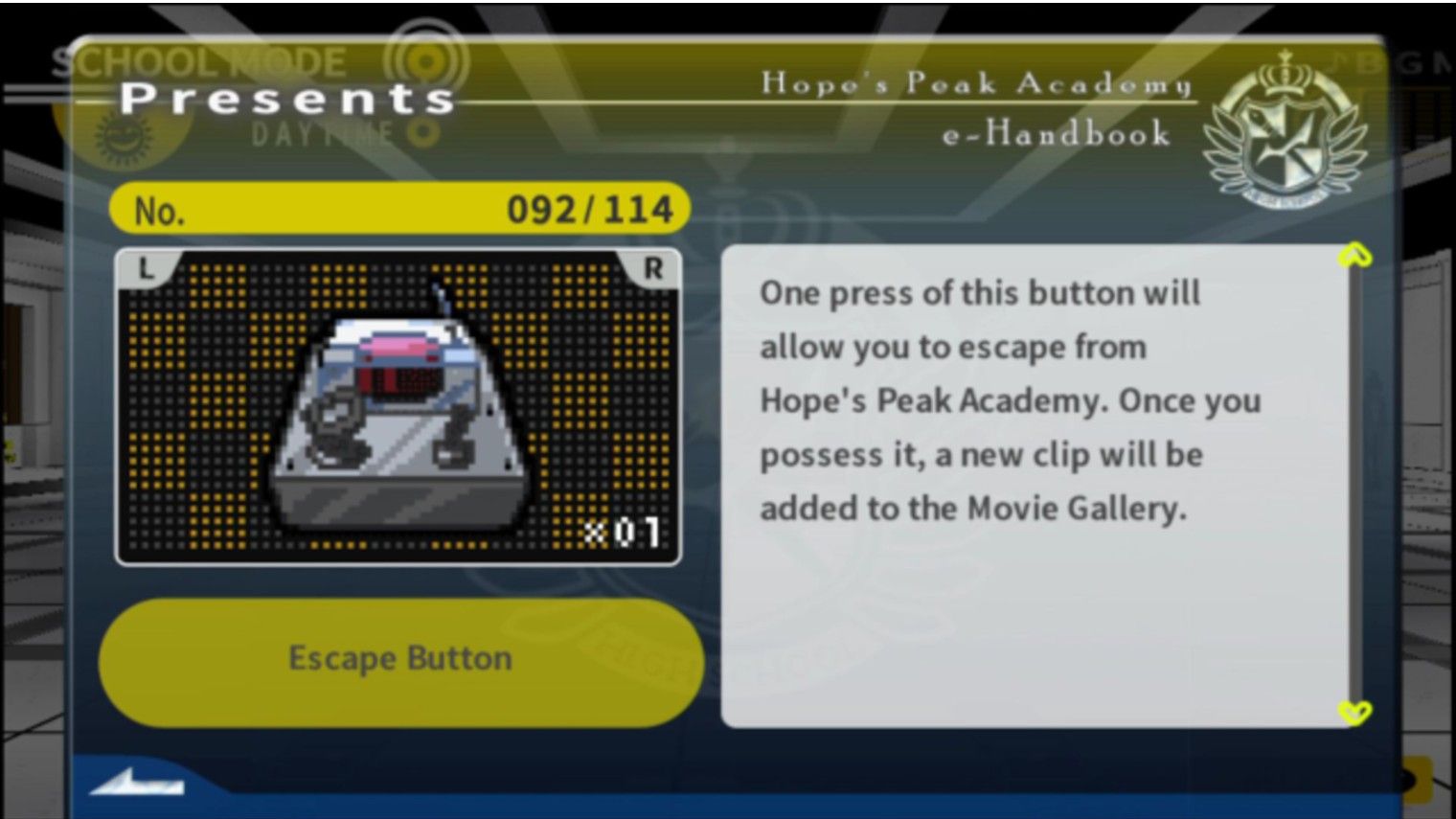 The first two items you can’t give as gifts unlock special bonus content. You can find A Man’s Fantasy (Item 91) in the MonoMono Machine during Chapter 2. If Makoto has it with him in Chapter 3, he’ll see a scene of a steamy bathhouse. The Escape Button (Item 92) might drop from the MonoMono Machine after you finish Chapter 6, and it will unlock an alternate ending that you can access from the main menu.