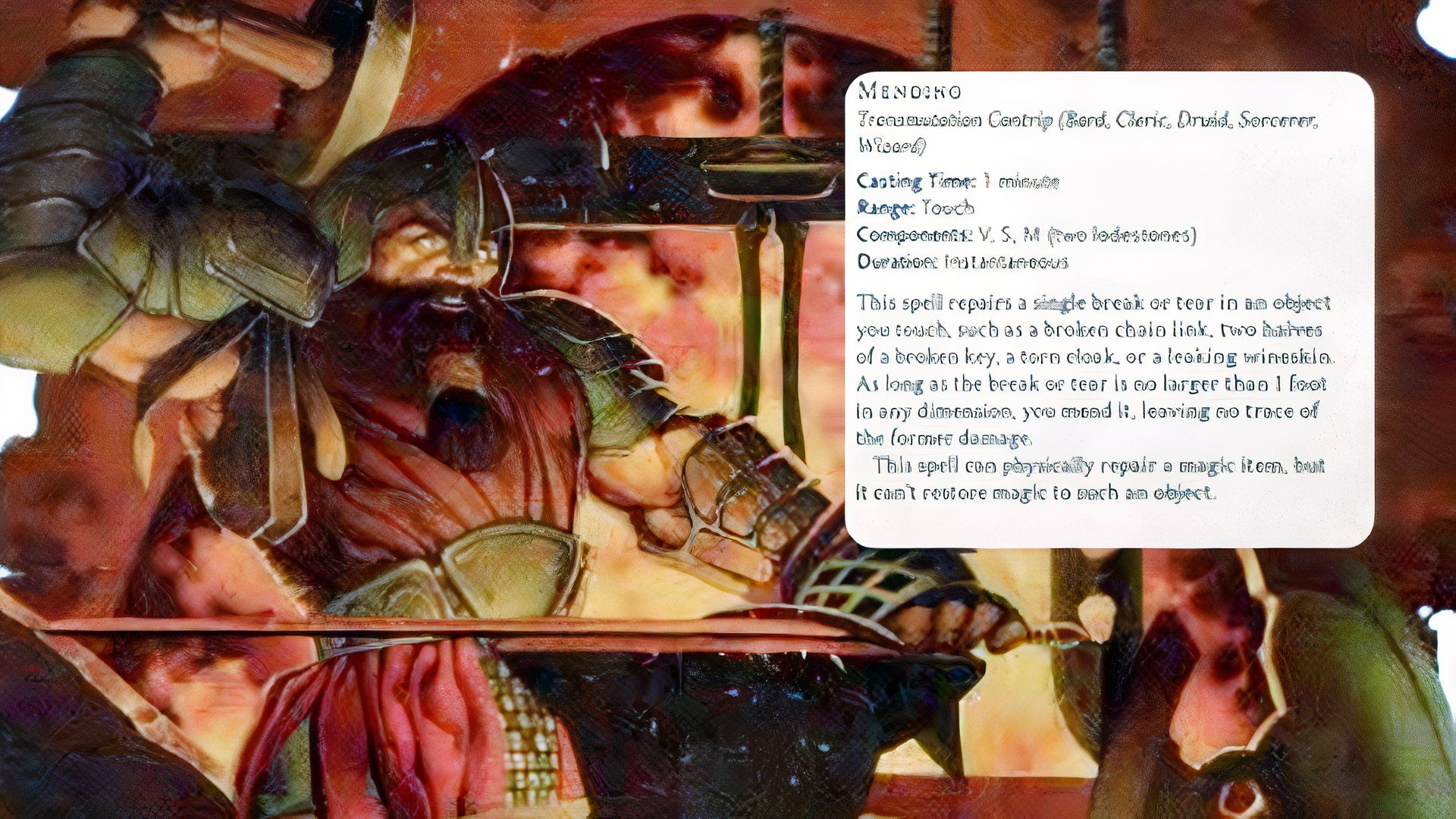 Image from Arms and Equipment The Mending spell is often seen as potentially helpful, but players struggle with exactly what it can fix. The spell description says it can repair a tear or break up to a foot in size – like a ripped cloak, a broken key, or a chain link. However, it frequently leads to arguments about whether a specific item qualifies. Everyone generally agrees that Mending can’t restore magical properties to enchanted items.