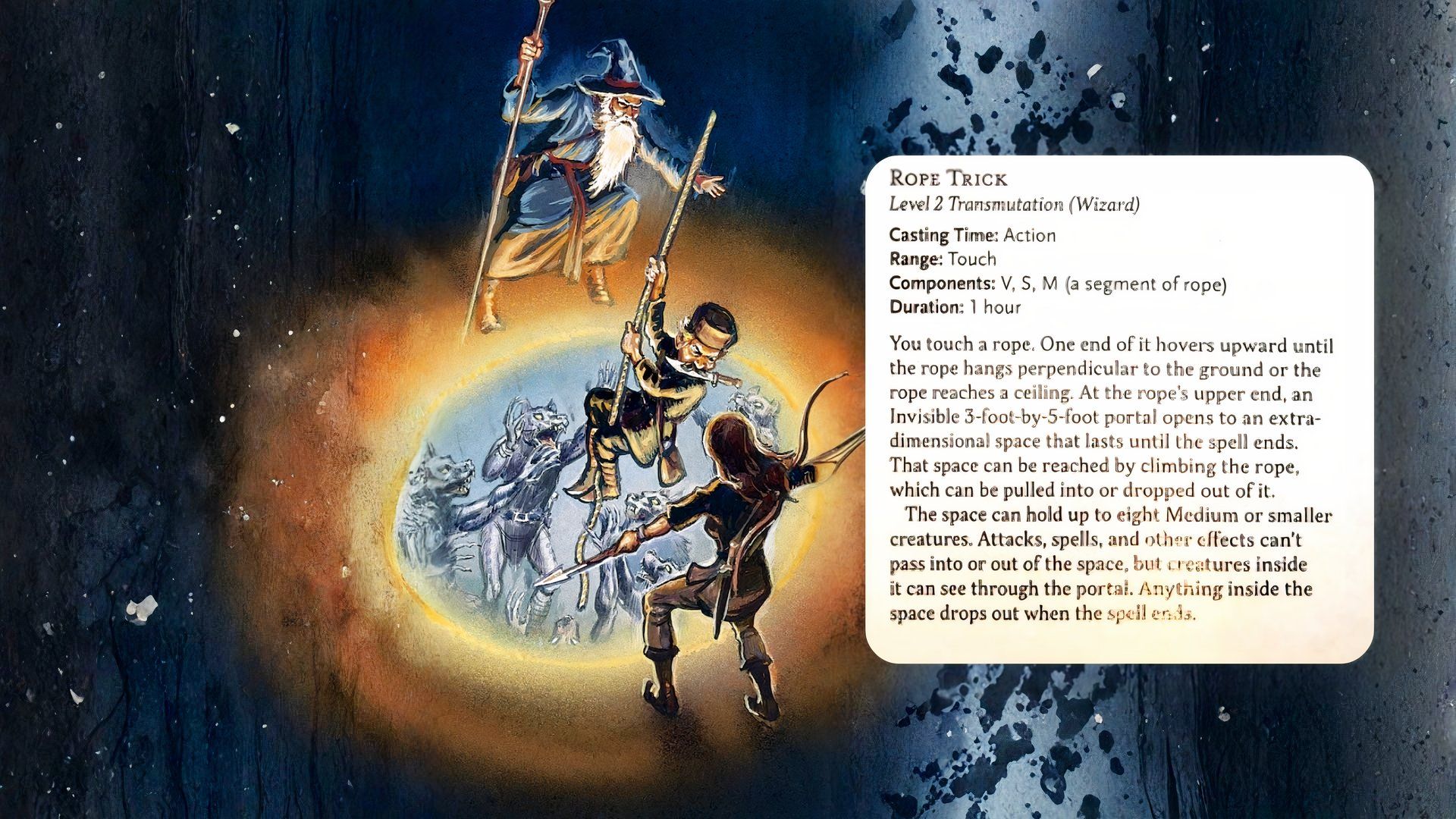 Image from Rope Trick_Magic the Gathering If you’ve played a role-playing game like Dungeons & Dragons or Divinity: Original Sin 2, you know it’s smart to always have a way to get out of a tough spot. This could involve items that let you move quickly, teleport, or safely break away from enemies to regroup or plan a counterattack. In D&D, there are many ways to escape, and players who like to be prepared can always use the Rope Trick spell to create a safe haven.