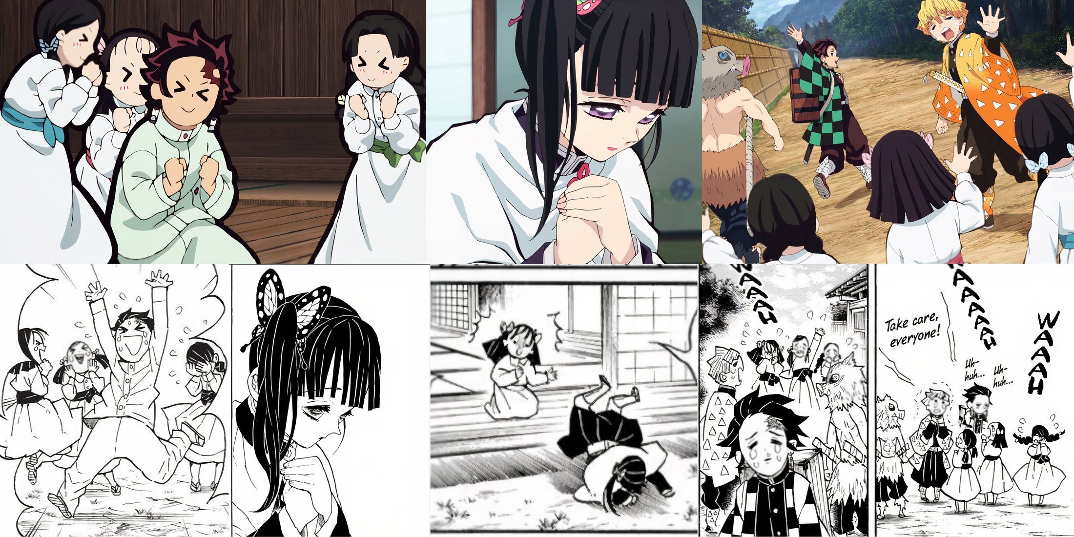 The Rehabilitation Training Arc let Tanjiro meet the people at the Butterfly Mansion, and he really connected with them – you can feel that connection in both the manga and the anime. The manga, however, goes a step further, showing Kiyo, Sumi, and Naho openly celebrating all of Tanjiro’s successes and even crying with happiness. They first tear up when he finally breaks the gourd, something they helped him train for, and again when it’s time for him and his friends to leave.