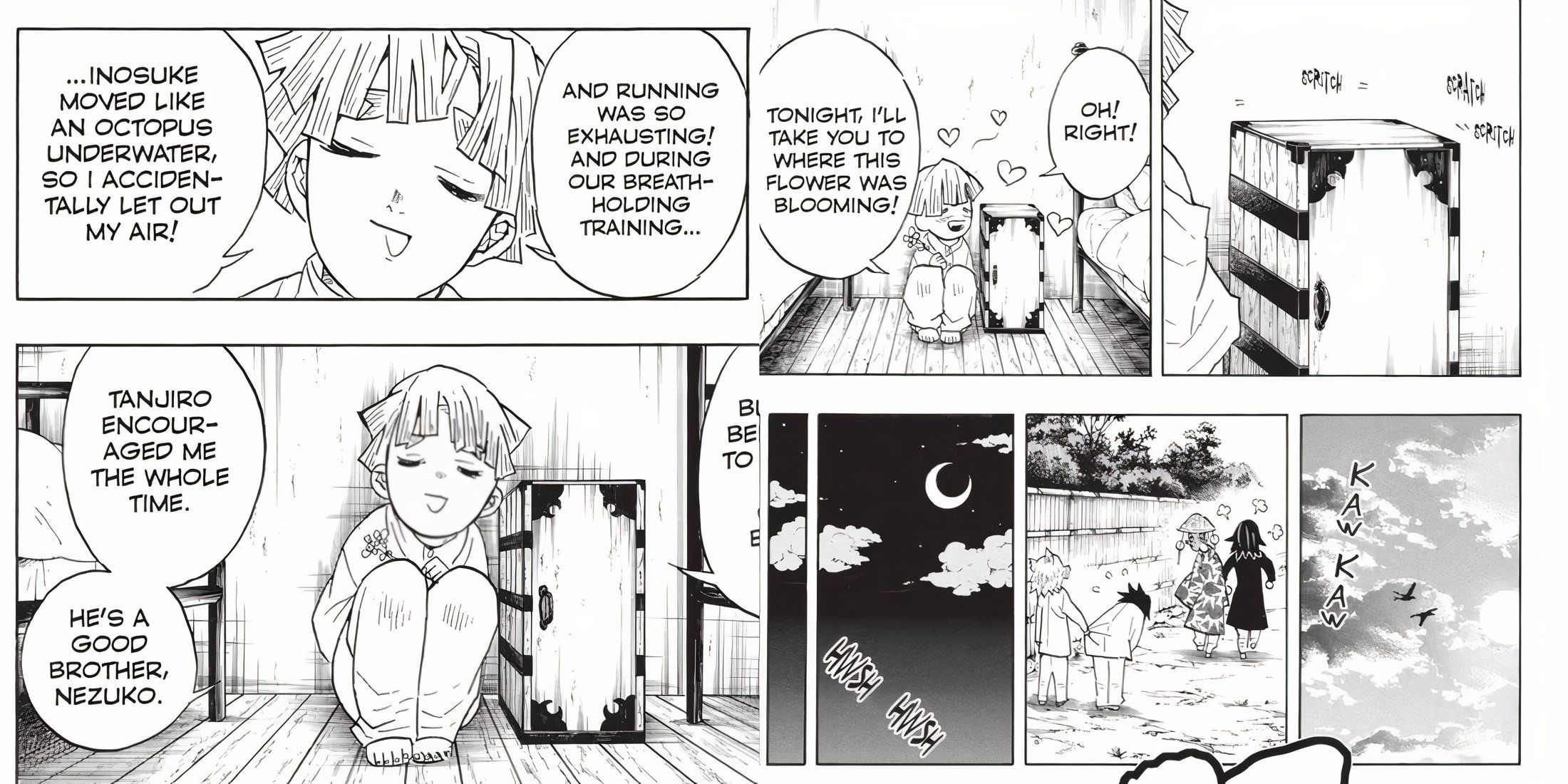 In the manga, Zenitsu has a sweet interaction with Nezuko, who is confined in a box. He cheerfully shares details about his day, holding a flower as he talks. He mentions his friends and expresses how much he looks up to Tanjiro, promising to show Nezuko where the flower grew. Nezuko responds by scratching the box, and it’s unclear if she’s happy or not. This short, endearing moment demonstrates Zenitsu’s growing fondness for Nezuko, a feeling that develops further throughout the series.