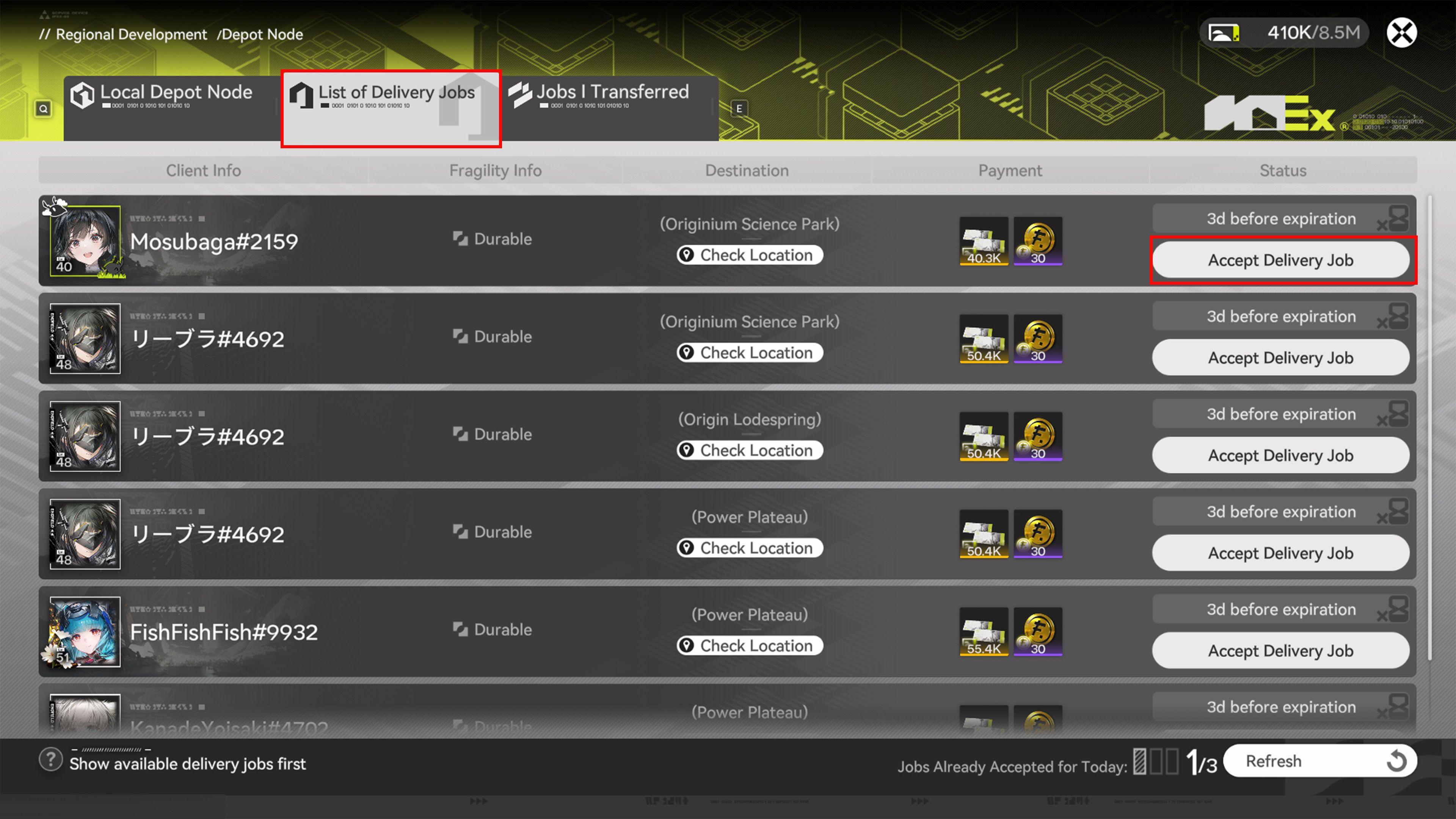 - List of Delivery Jobs: See delivery jobs posted by other players.