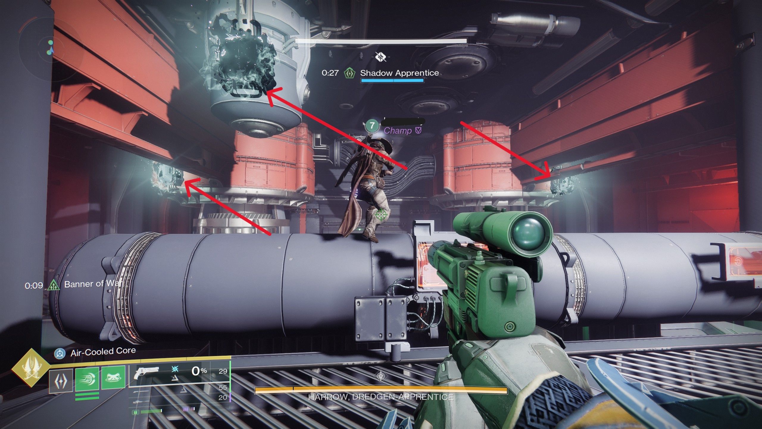 During the Harrow fight, you can weaken his shields by shooting the blue fuses on the walls. This opens a hatch that you can lure Harrow into, causing him to lose a third of his shield. Repeat this process twice. Then, use the Shadow Apprentice buff to target the batteries on the walls and activate the large blue generators, again luring Harrow to take the hit. This will break his final shield layer and start the damage phase.