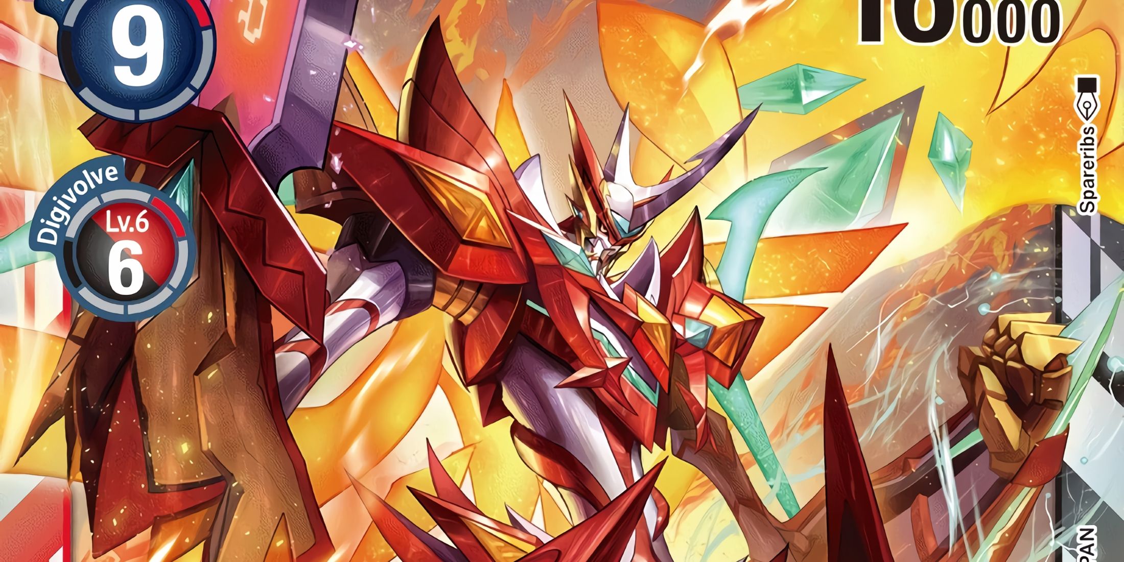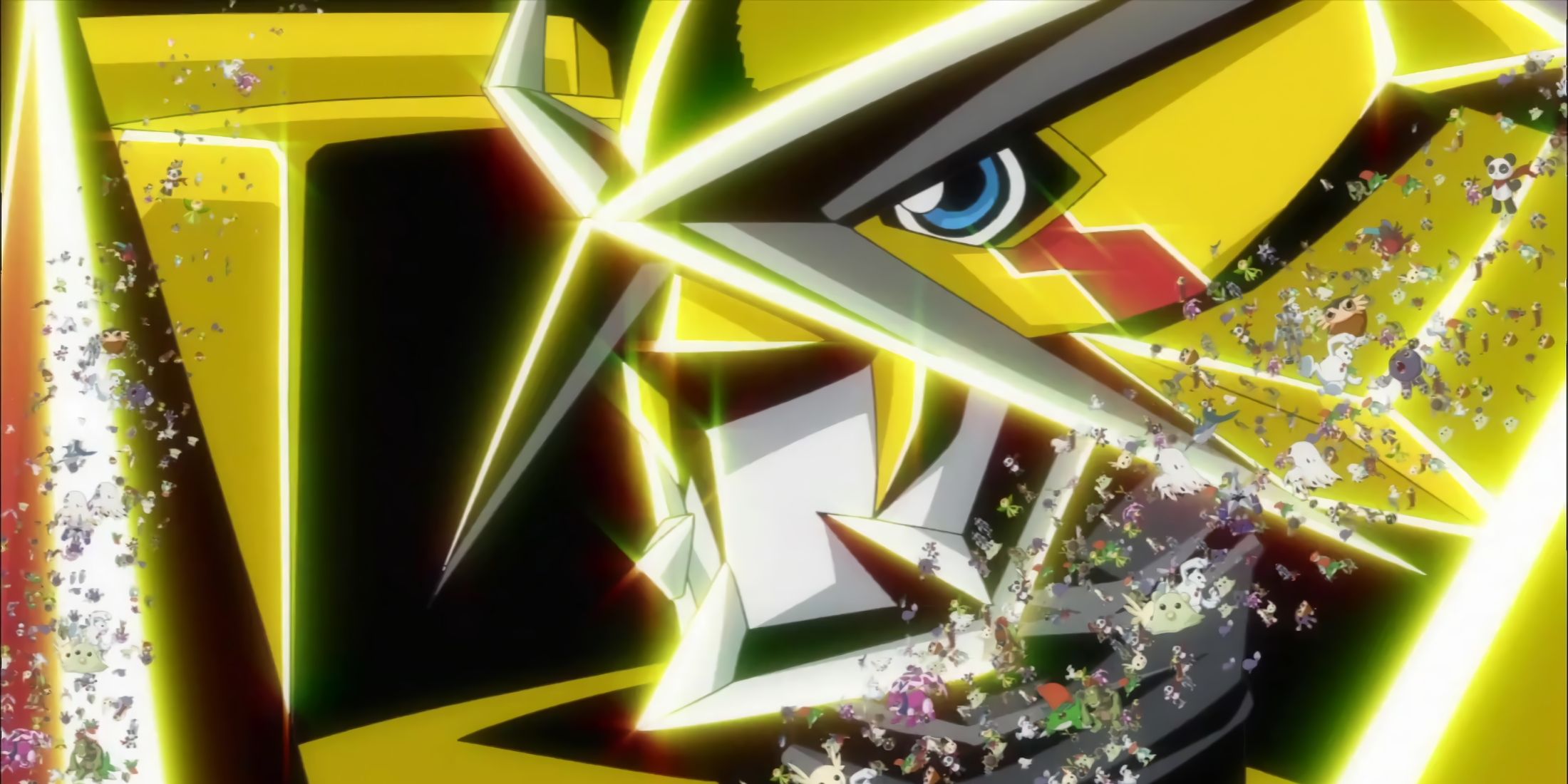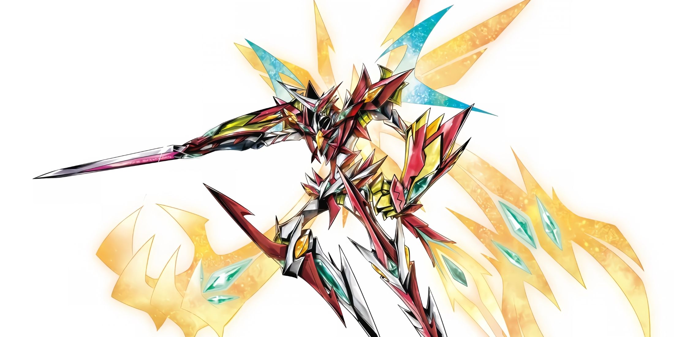 This powerful being formed when the kindest Digimon merged together, carrying all their dreams for a brighter future. Its entire body is covered in an incredibly strong, gold armor that can withstand nearly any attack. What was once a microphone, used by the talented Shoutmon to amplify his voice as a weapon, has now become a blazing sword, capable of destroying evil with a single touch.