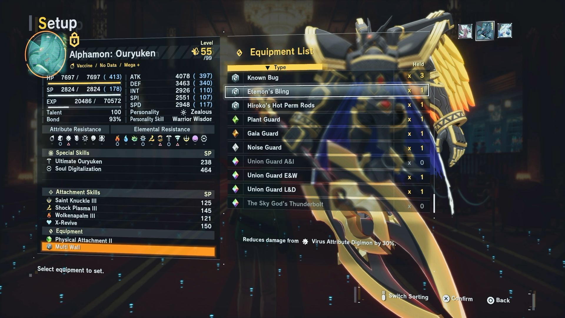 Etemon’s Bling equipment isn’t effective against all enemies, but it’s still quite helpful because many of the villains in Digimon Story: Time Stranger are the Virus type.