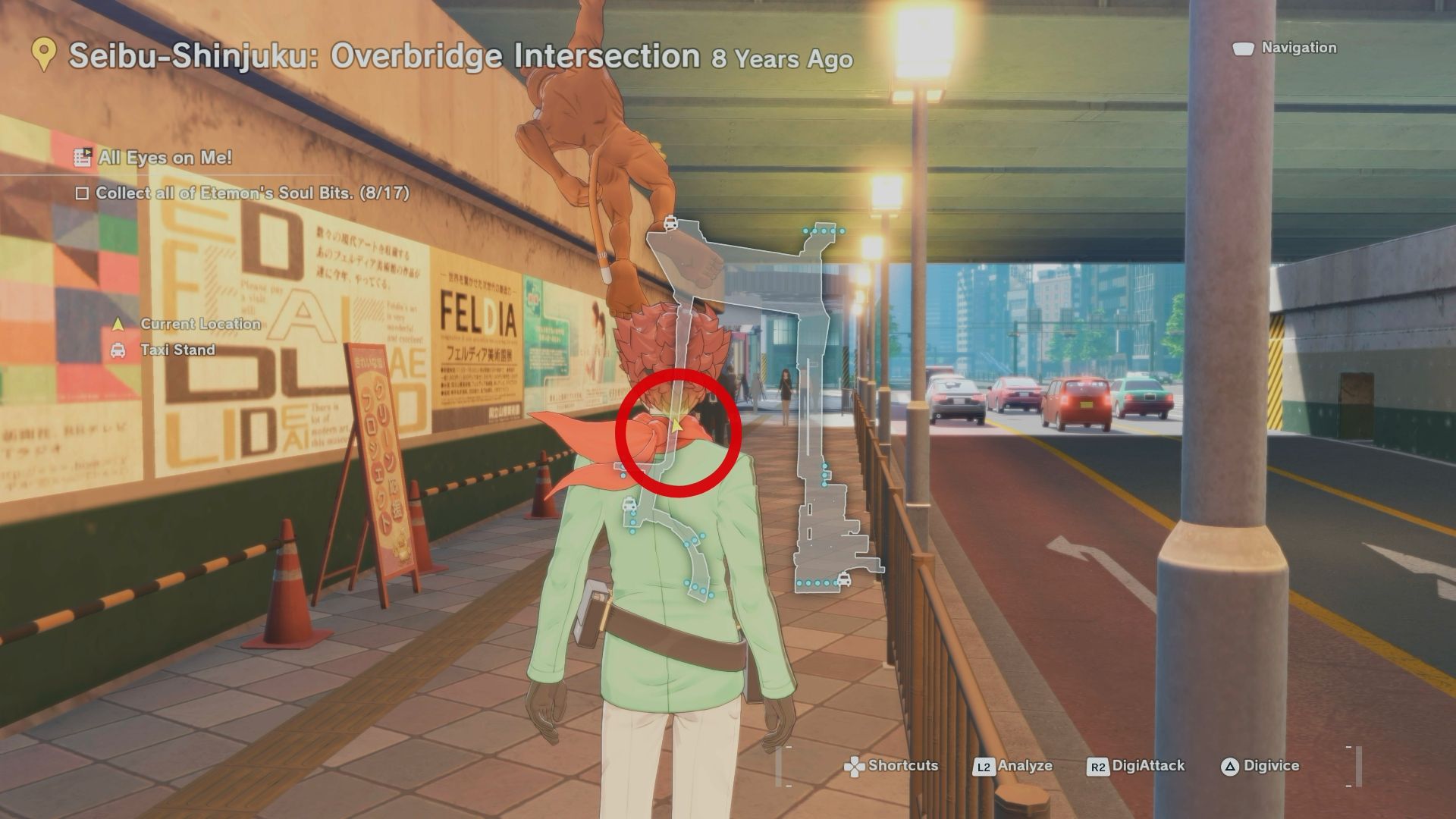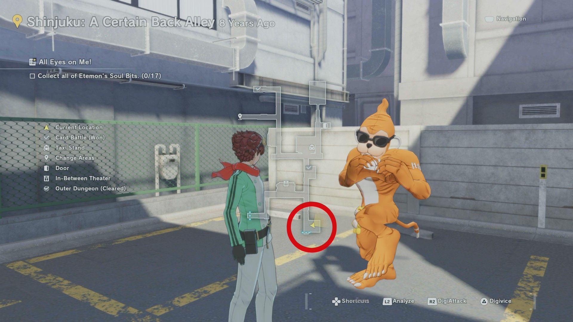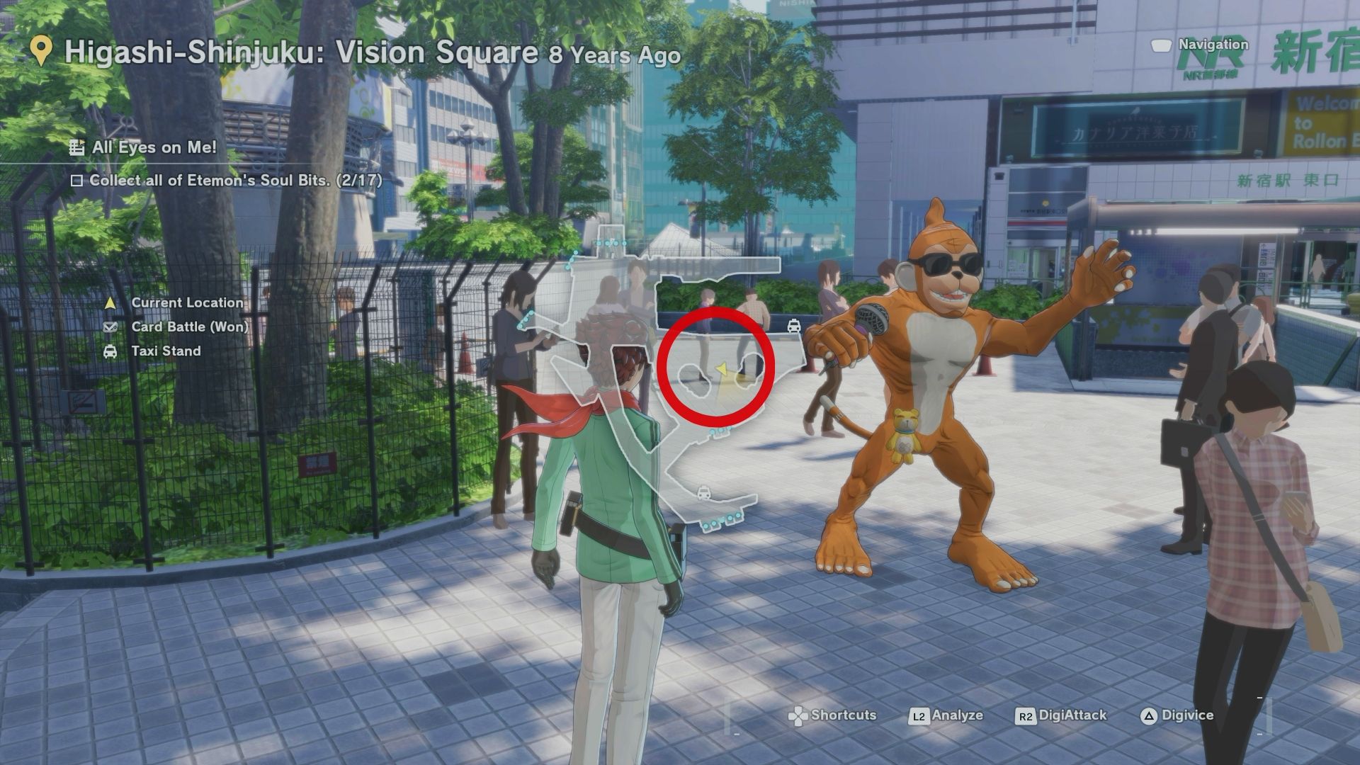 Let’s continue from the back alley behind Shinjuku. Good news – there’s an Etemon nearby! Make sure you battle it using DigiAttack for it to register. After that, head south to reach the shopping district.