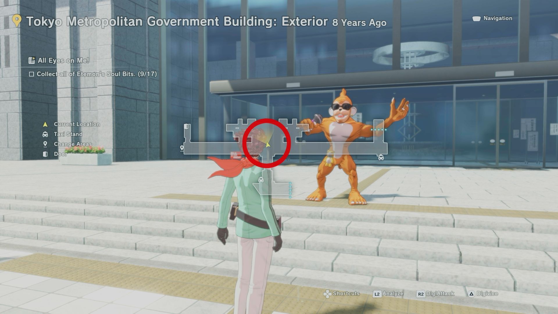 You’ll find Etemon outside the building, and he’ll either be supporting the government’s plans or speaking out against them – it’s up to you to decide which!