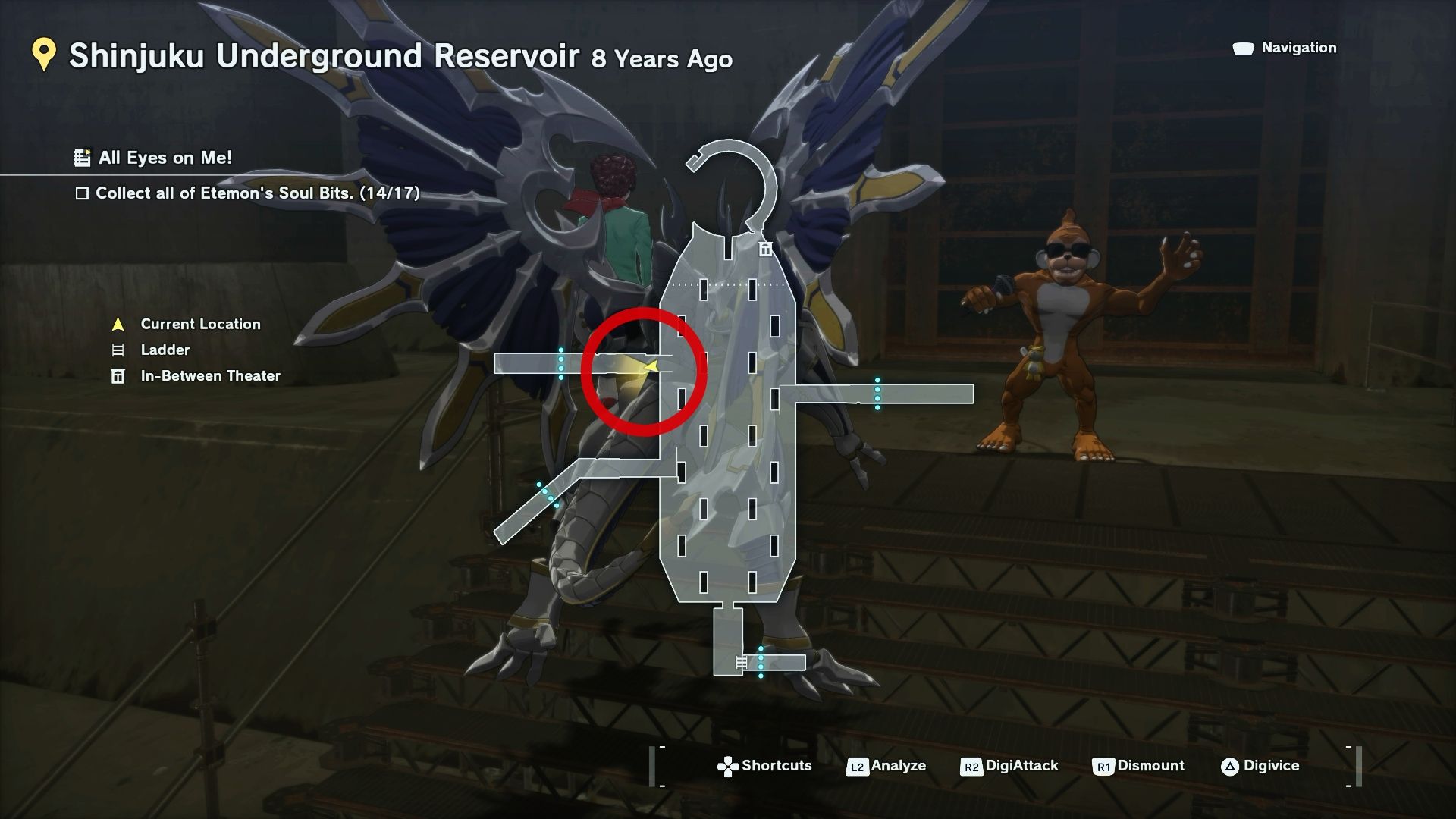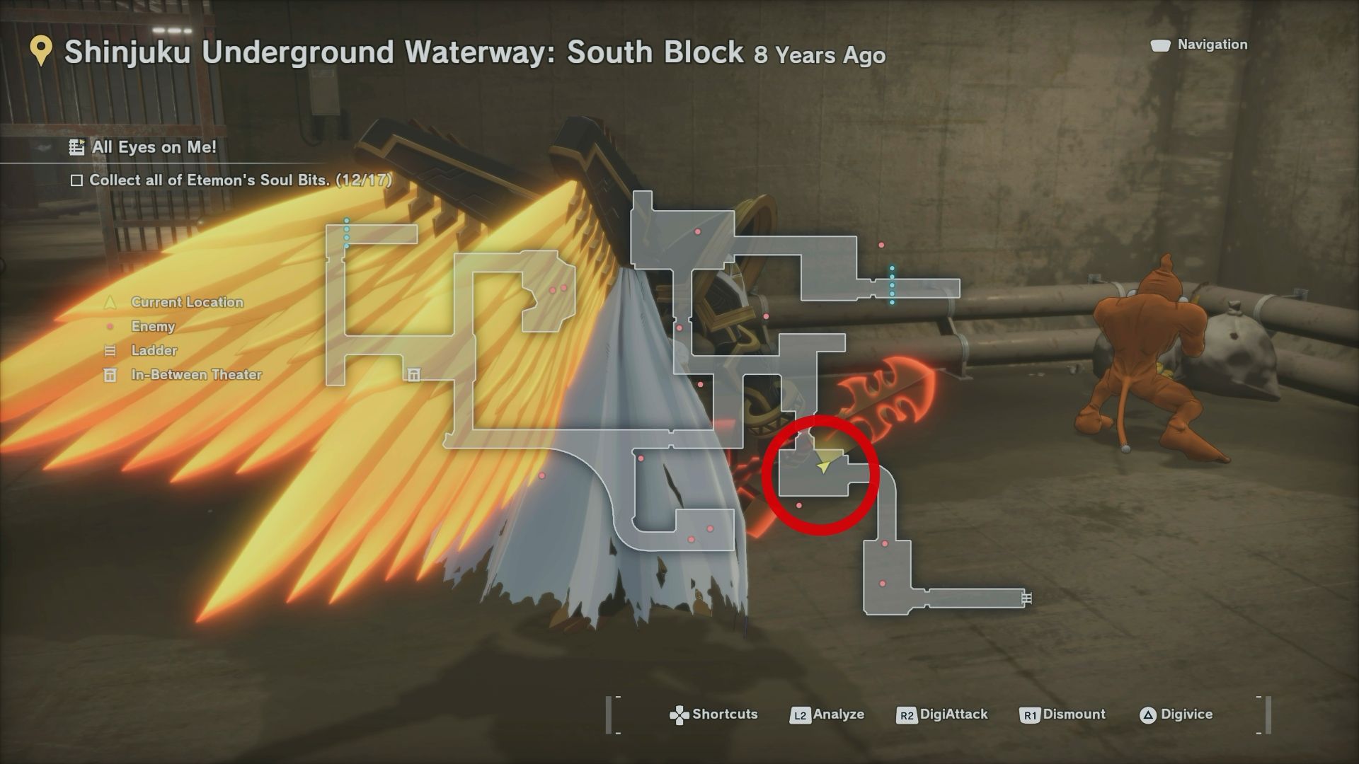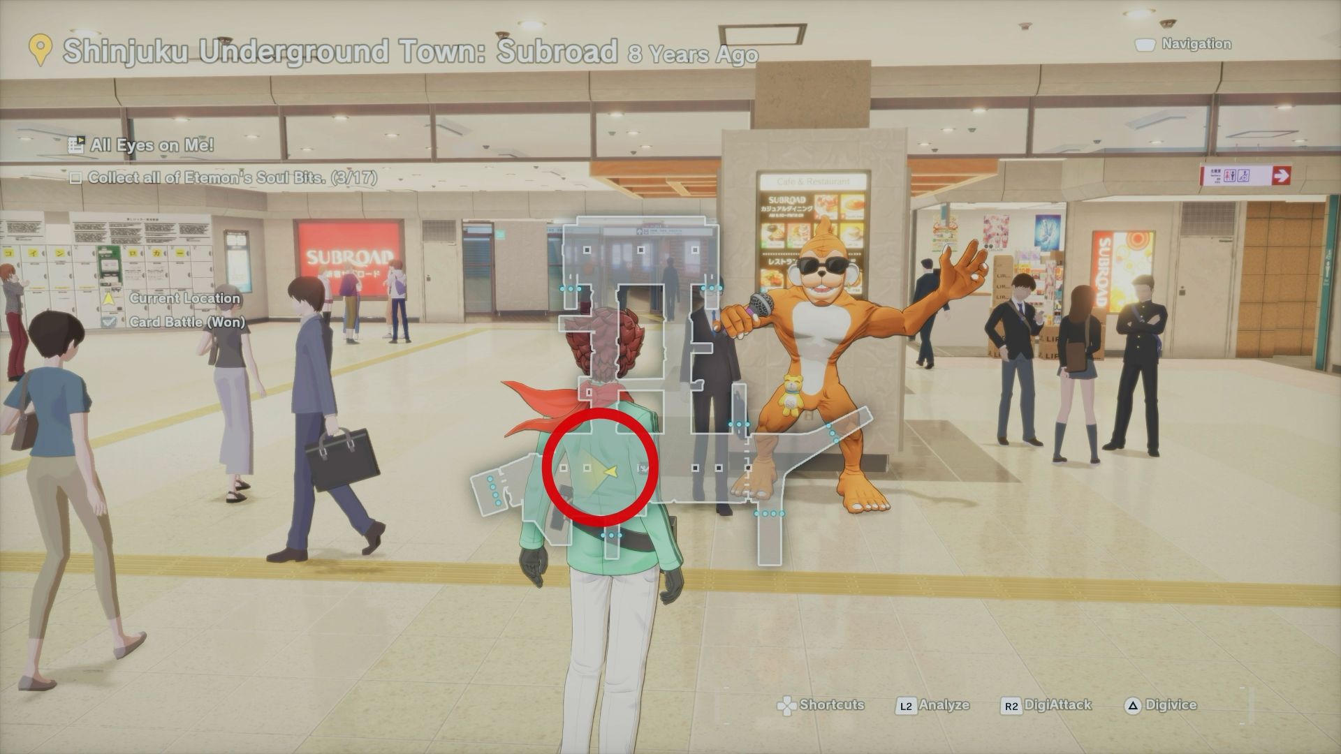 You’ll encounter another Etemon right away, so defeat it. Then, head to the metro and take it to Higashi-Shinjuku, specifically Second Avenue.