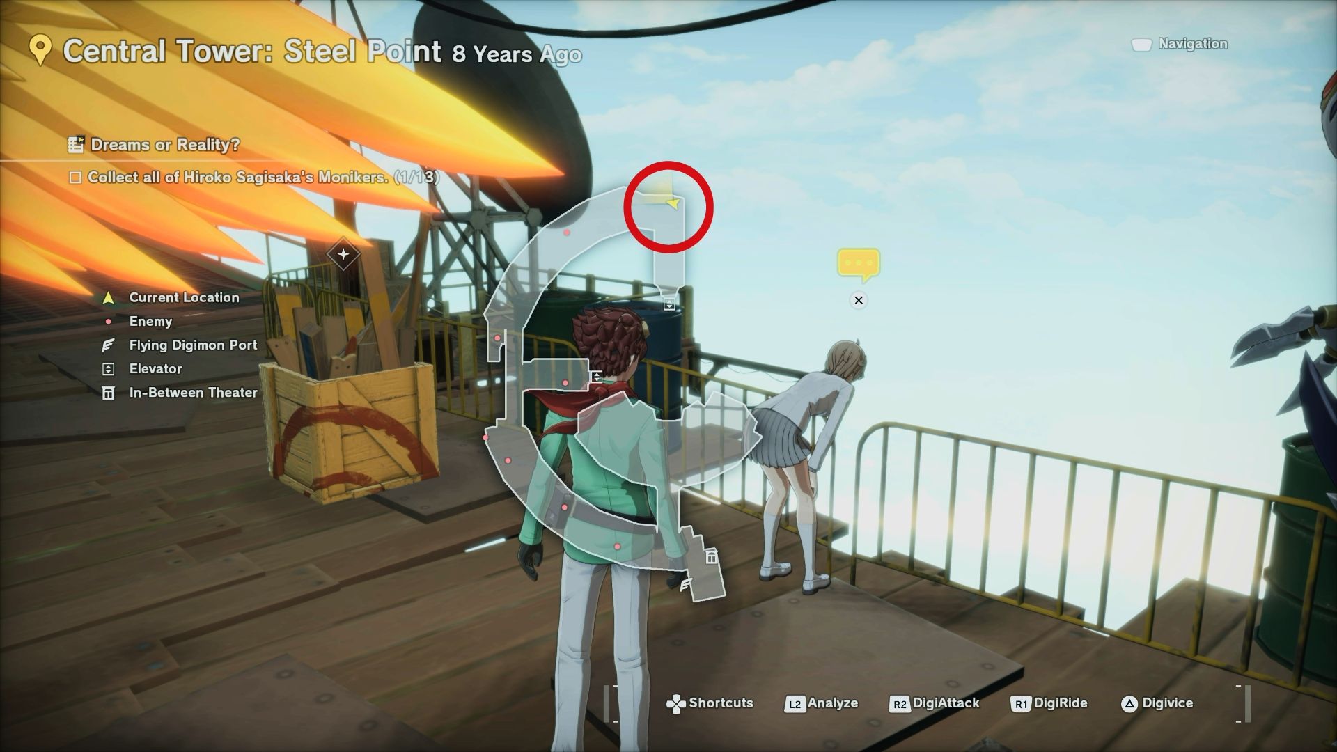 Go back in time to Digital Village as you were eight years ago, and then ride on Birdramon to reach the top of Center Tower.