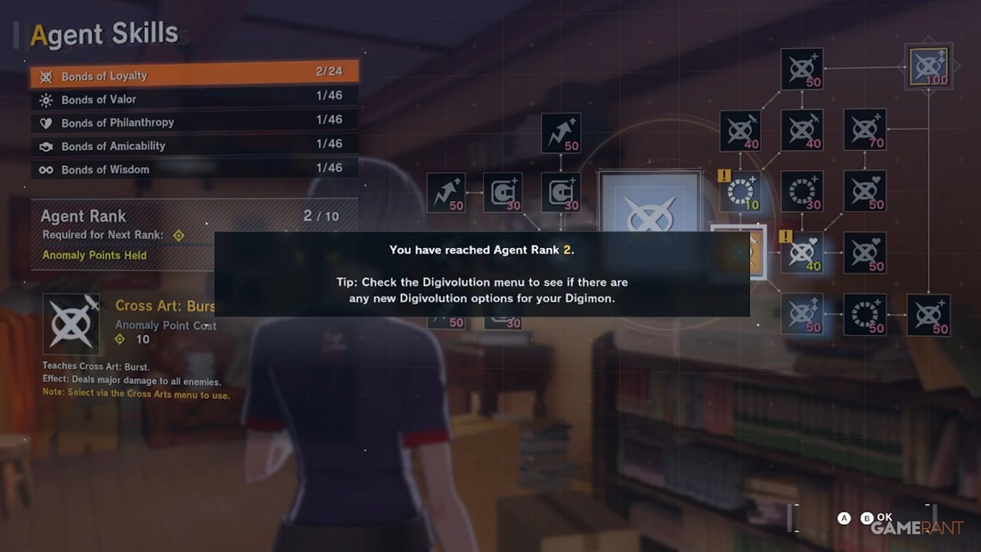 When you access the Agent Skills menu, you can use Anomaly Points to learn new abilities for both yourself and your Digimon partners. You earn Anomaly Points by finishing missions as you advance the main storyline, and you can also obtain them by completing optional side missions.