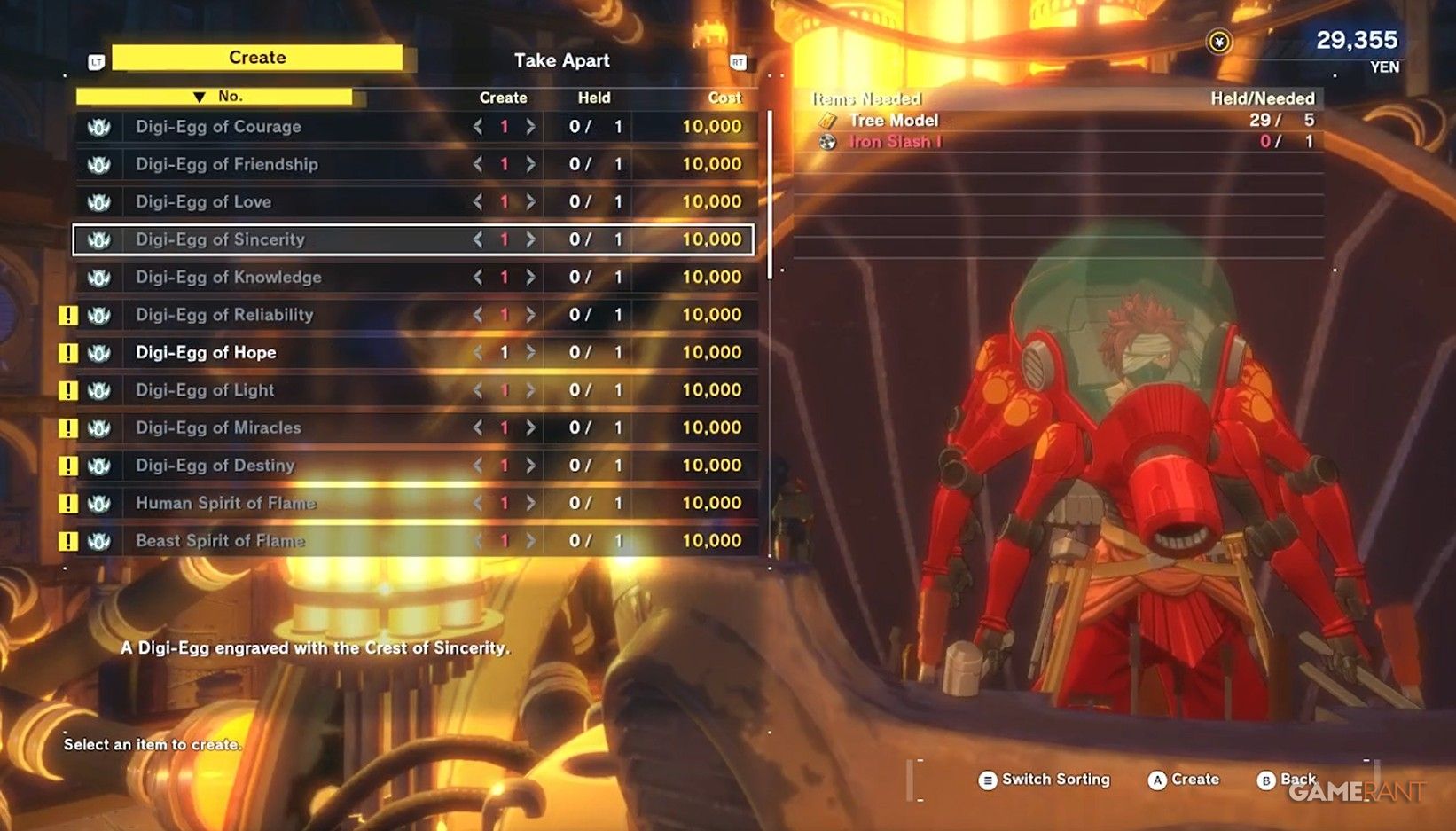 If you have enough Yen and Tree Models from completing the main story, you’re all set. But if you’re short on materials, talk to Mirei at the In-Between Theater and head to the Hall of Materials Outer Dungeon. You can battle Digimon like MudFrigimon there to collect what you need to create the Digi-Egg of Sincerity.