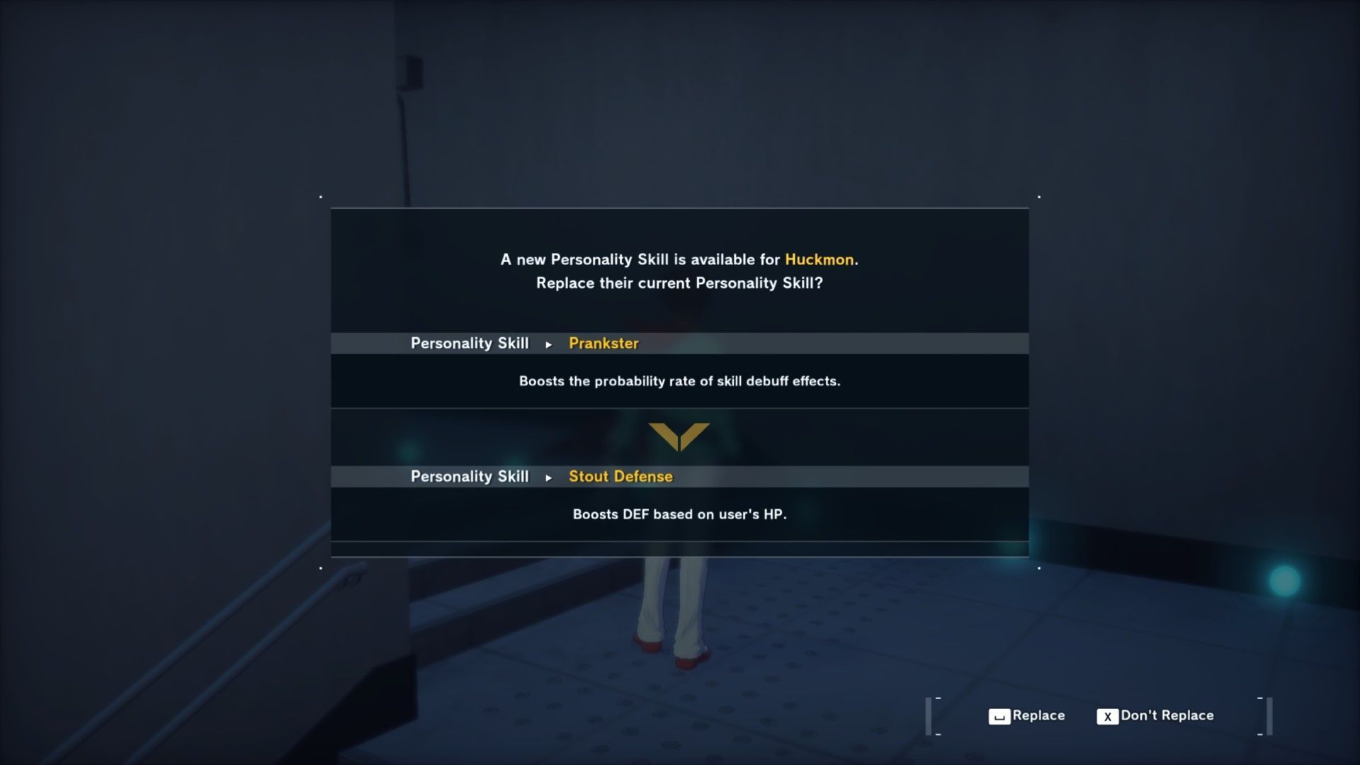 Personality Skills are abilities Digimon gain as their personality changes, either slightly or into one of the four main Personality Traits. They can be learned naturally during conversations, but a Digimon can only have one active skill at a time. When a Digimon learns a new Personality Skill during a conversation, a message will ask if you want to replace the current one. You can confirm this replacement by pressing X (on PC).