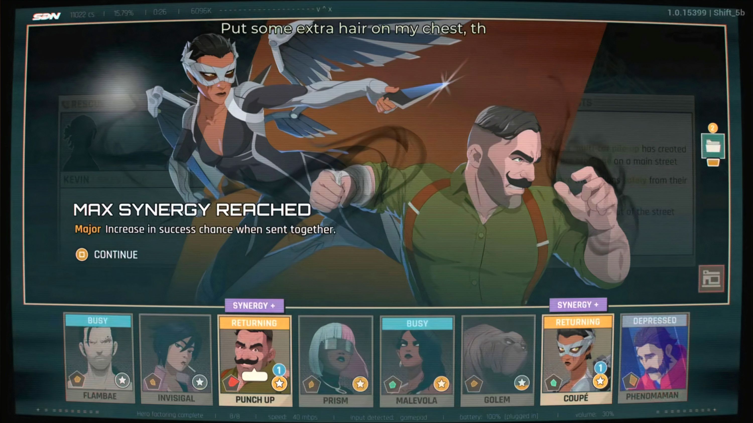 The combination of Punch Up and Phenomaman in Dispatch is significantly more effective than using Malevola and Waterboy – but it requires passing up the opportunity to add Waterboy to your team in Episode 4. Phenomaman starts with excellent stats, and by that point in the game, players should have already developed Punch Up’s stats to a high level. Because of Punch Up’s reliable Hard Head ability, this pairing is very strong. The main drawback is that both heroes focus on Combat and Vigor, so players will need to avoid Waterboy and consistently send Punch Up and Phenomaman on missions that emphasize those skills.