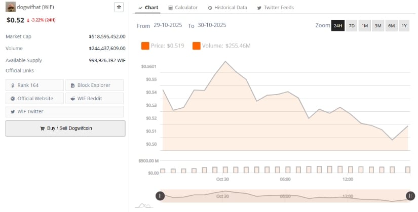 Data from BraveNewCoin shows Dogwifhat trading at $0.52 with a market cap of $518.59 million and 24-hour trading volume of $244.43 million. The token currently ranks #164 by market capitalization, with an available supply of 998.9 million tokens. The steady contraction in valuation highlights cooling speculative activity and fading liquidity since the Q1 2025 highs-like a dying fire, flickering but still managing to burn your fingers. 🔥