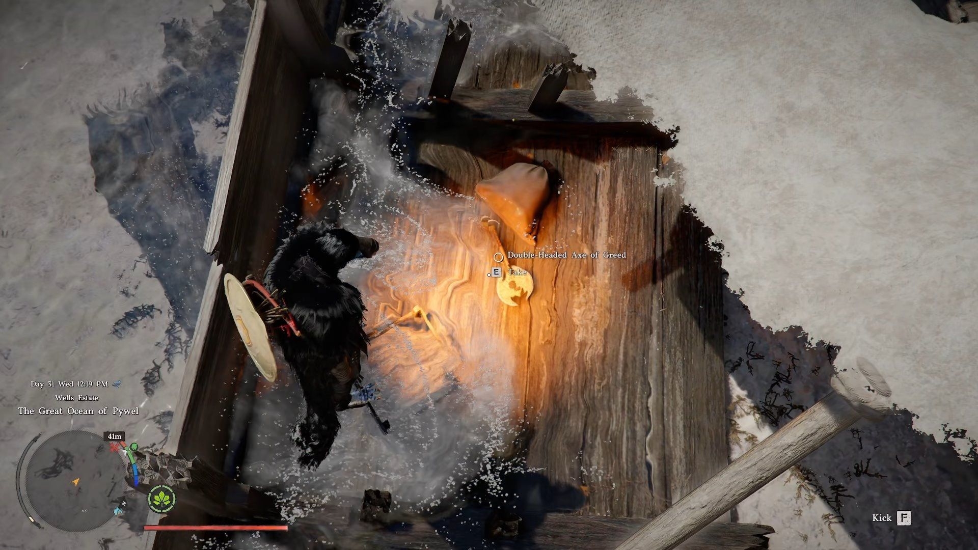 The Double-Headed Axe of Greed is floating in the water, hidden underneath the debris.