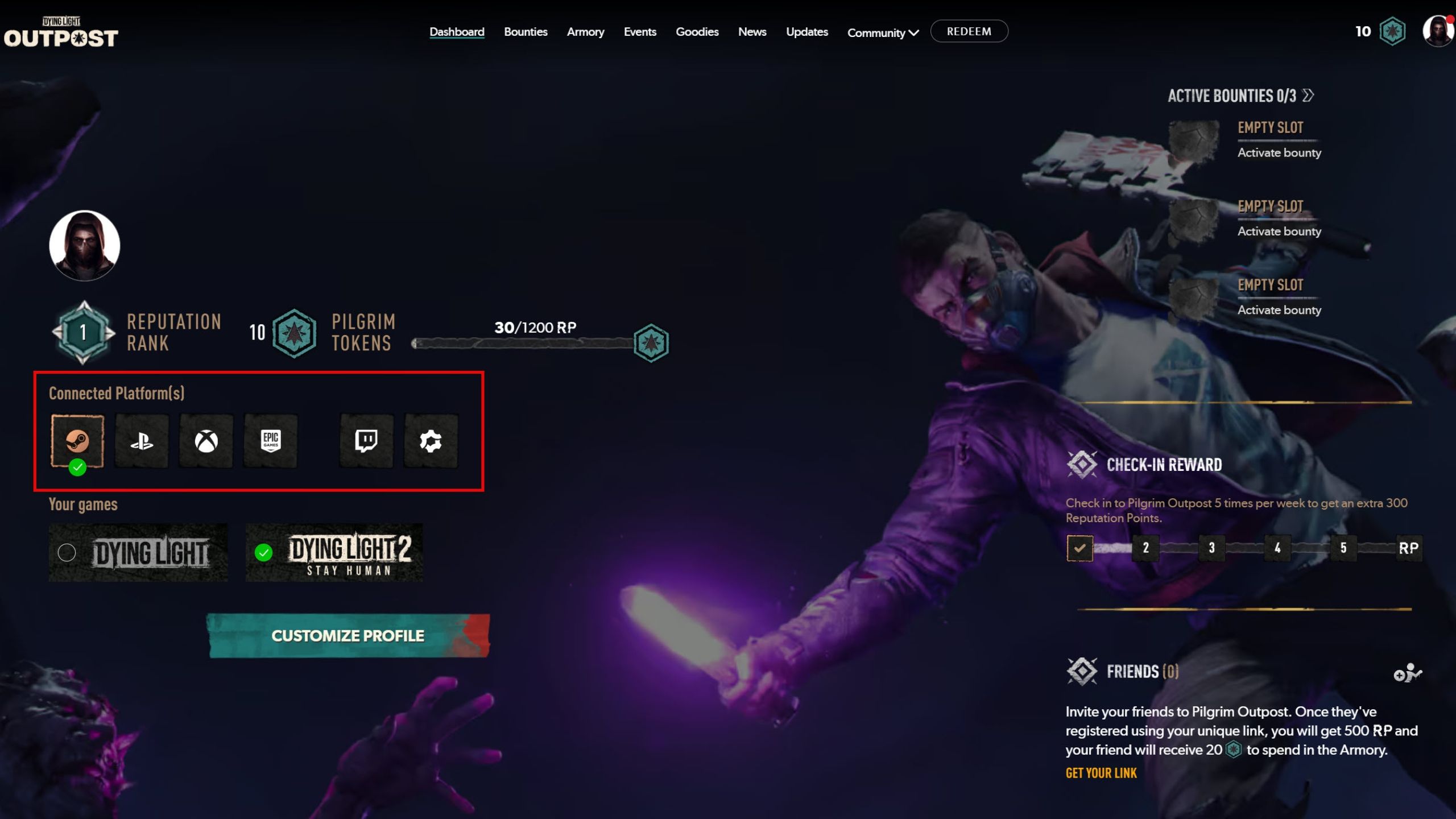 - Complete the authorization process, and your account will be connected to the Dying Light Outpost dashboard.