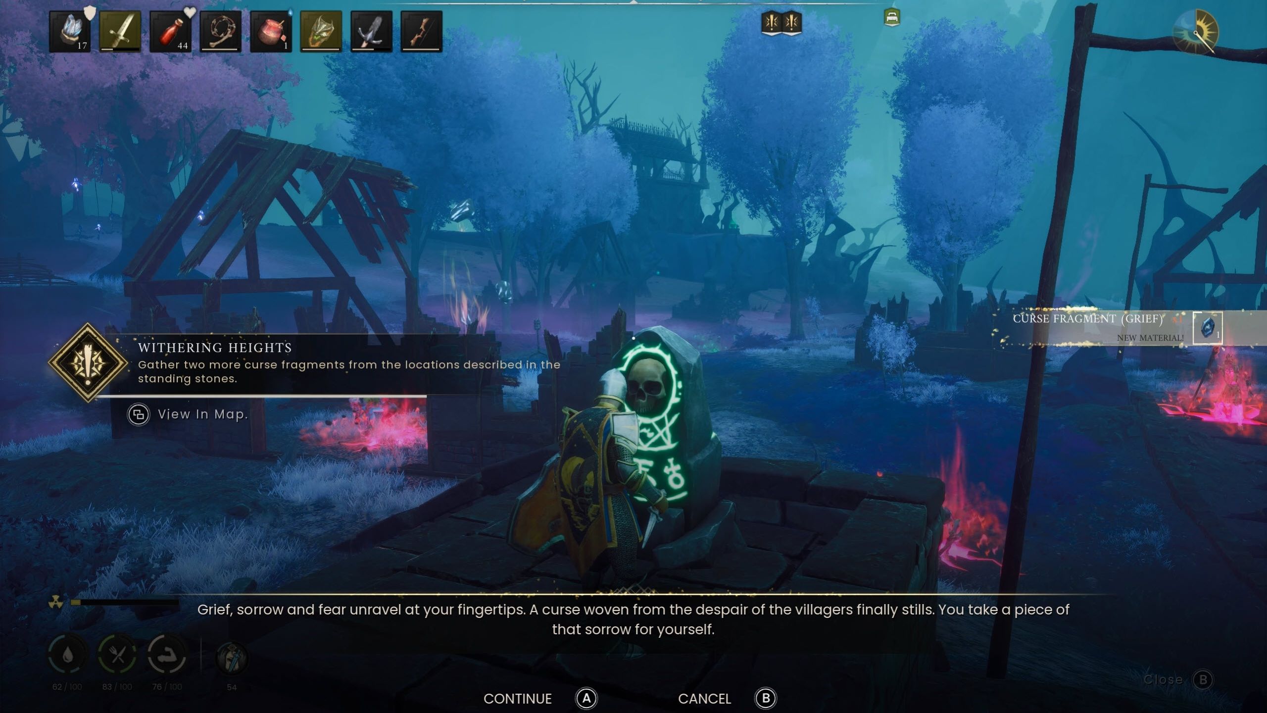 Okay, so I headed back to the entrance of Emberwood Village, and whoa – all four shrines were glowing! That meant the barrier was down, finally. I rushed inside and grabbed the Curse Fragment (Grief) from this glowing green stone. One fragment down, and I’m making real progress with the Withering Heights quest in RuneScape Dragonwilds!