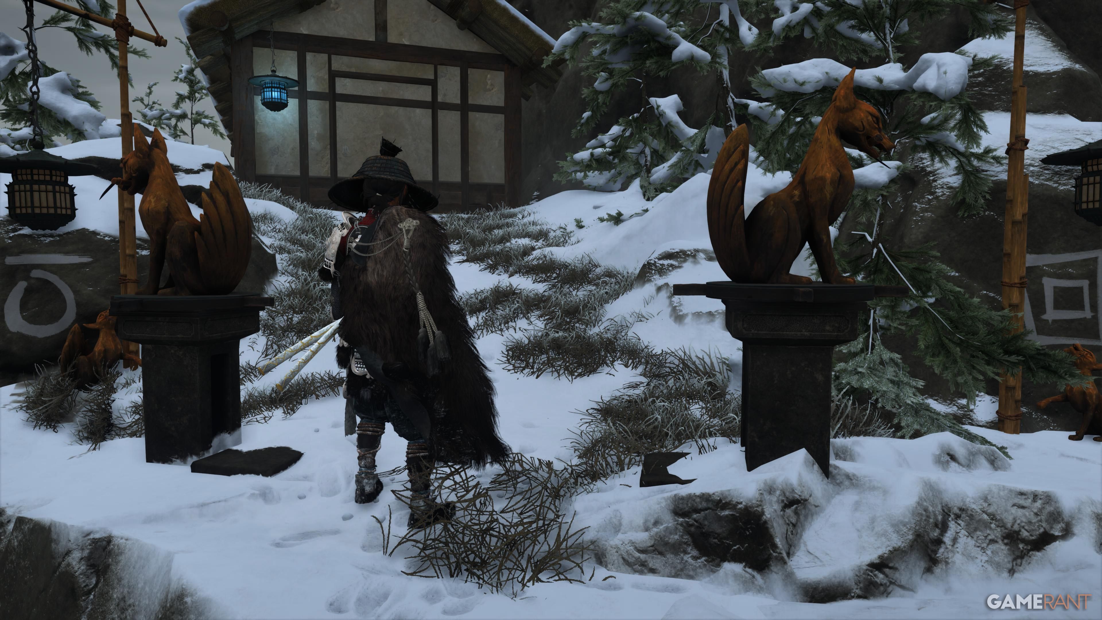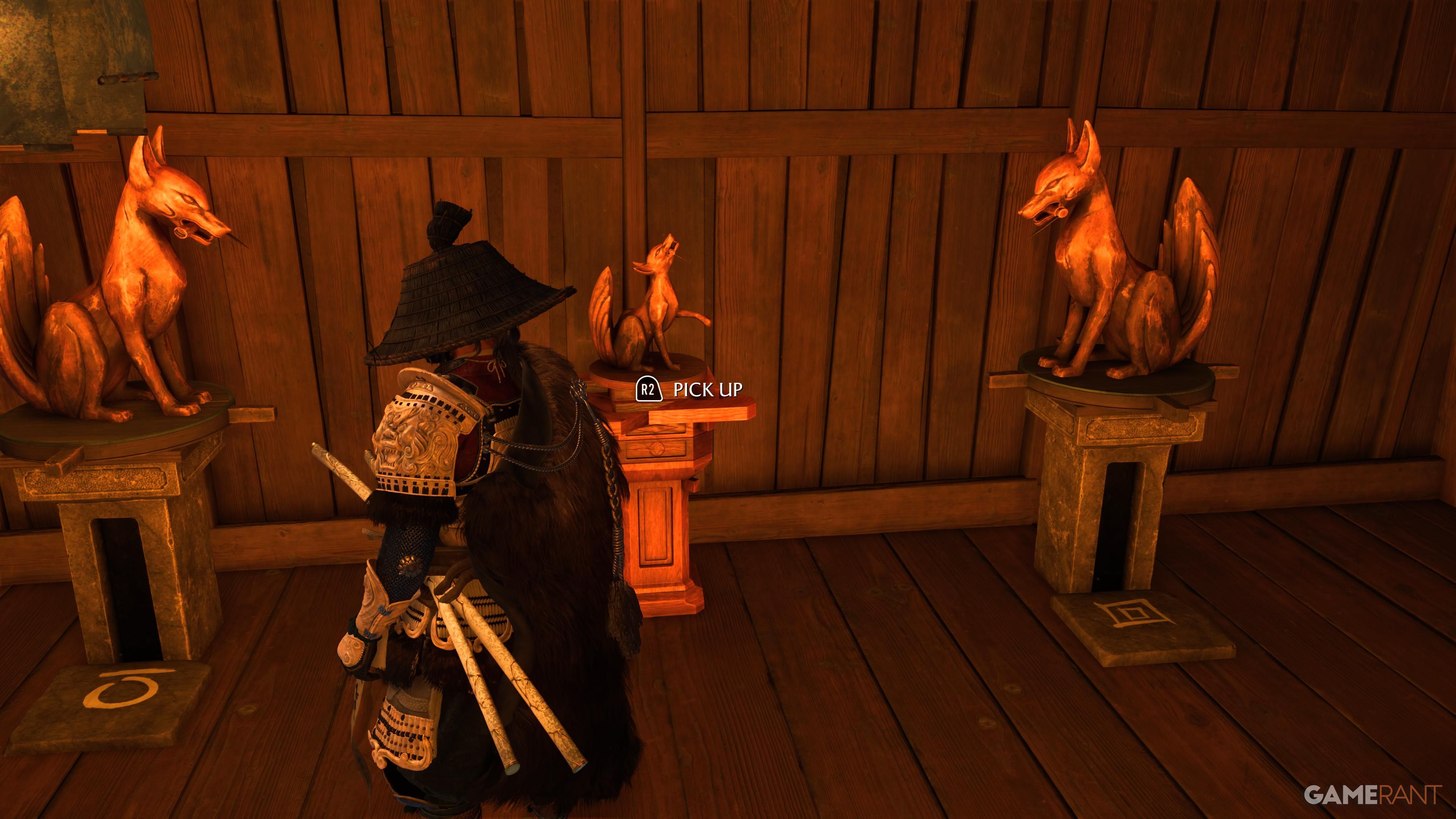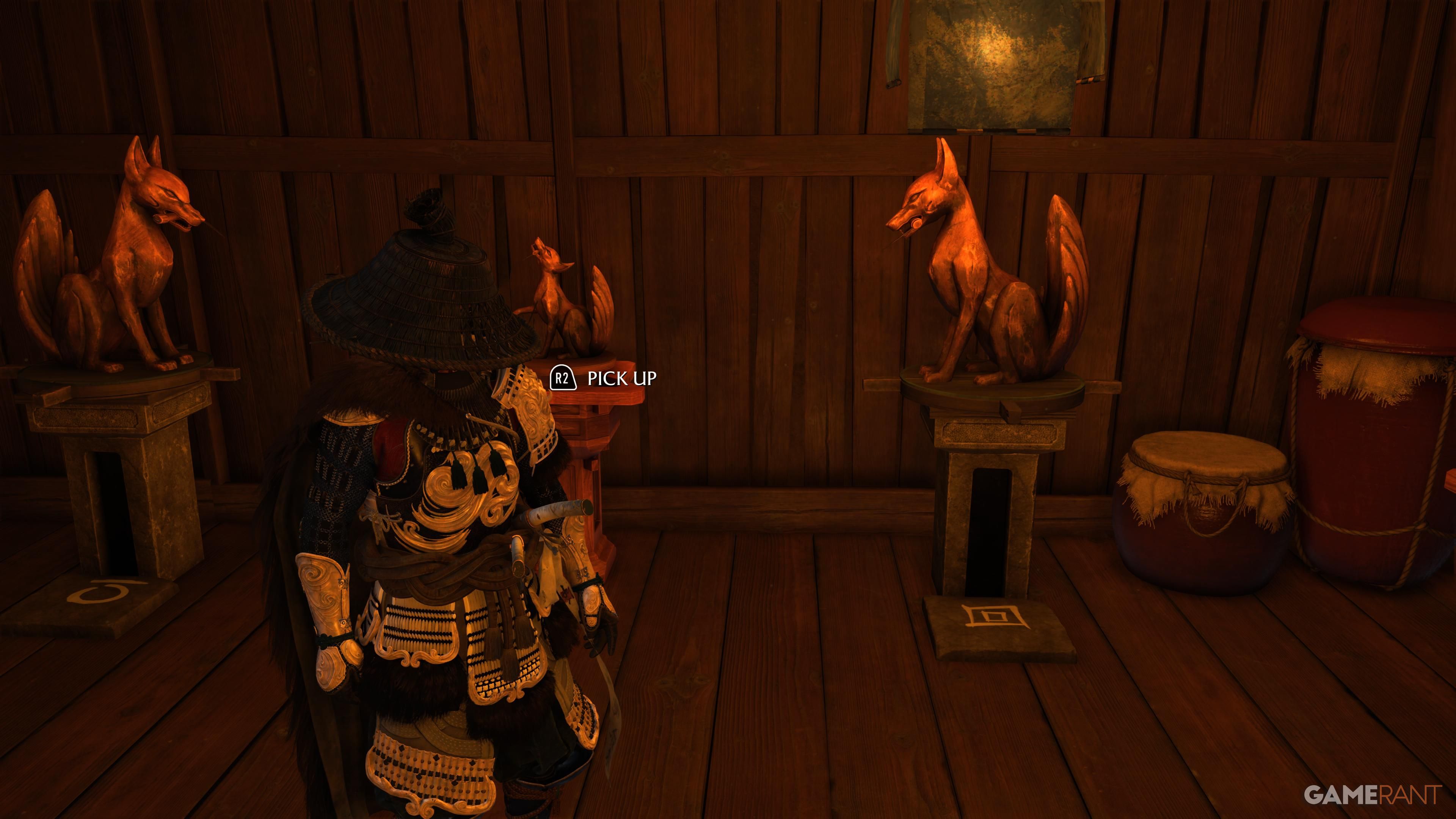 First, arrange the fox statues on the left so they are facing each other. This lets you pick up the statue in the center and move it onto the left pedestal. Repeat this process on the right side, making those statues face each other as well. After you place the second statue, you’ll be able to interact with the wall ahead, allowing you to pass through and reach the Hunting Camp Hideout.