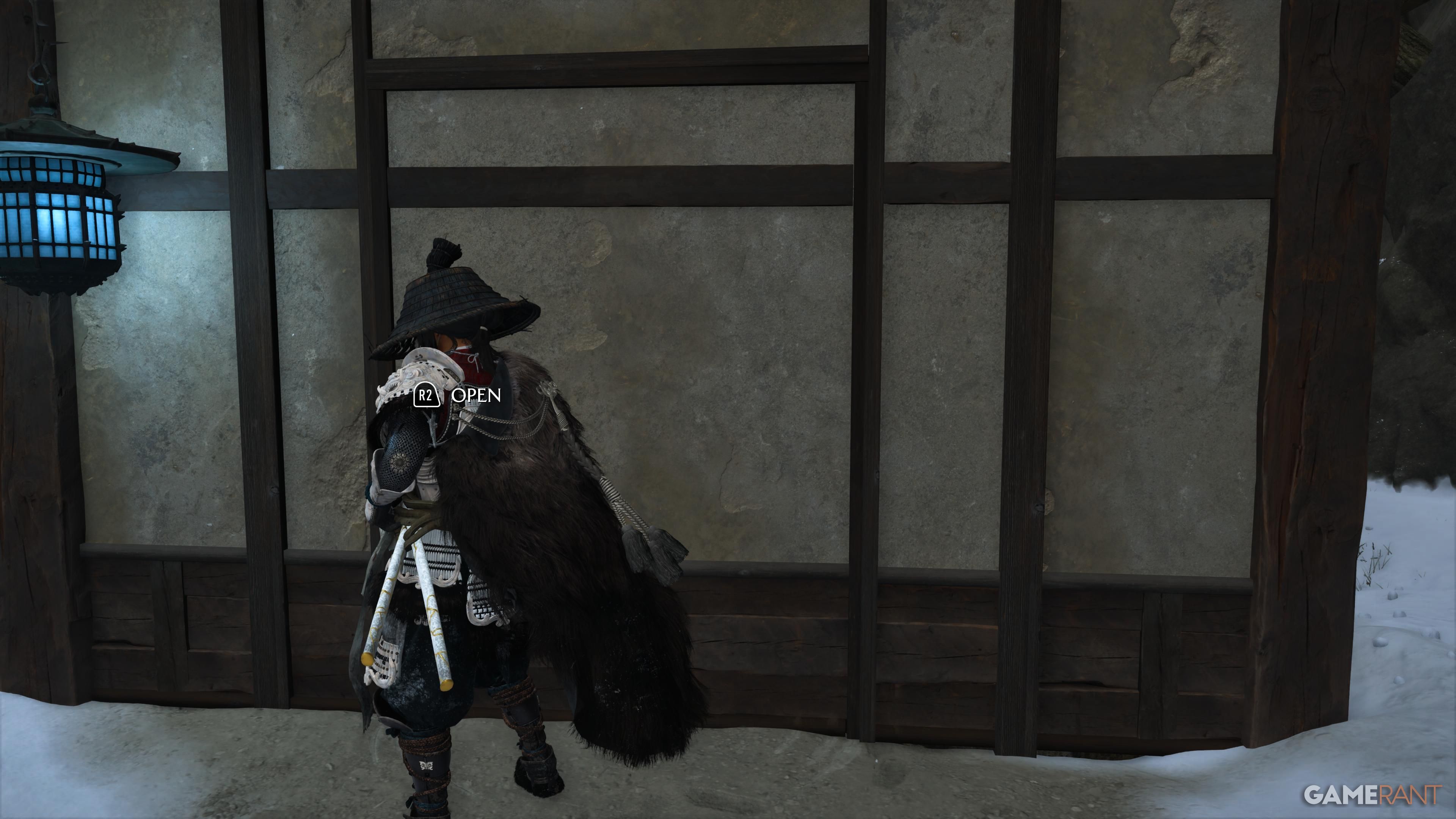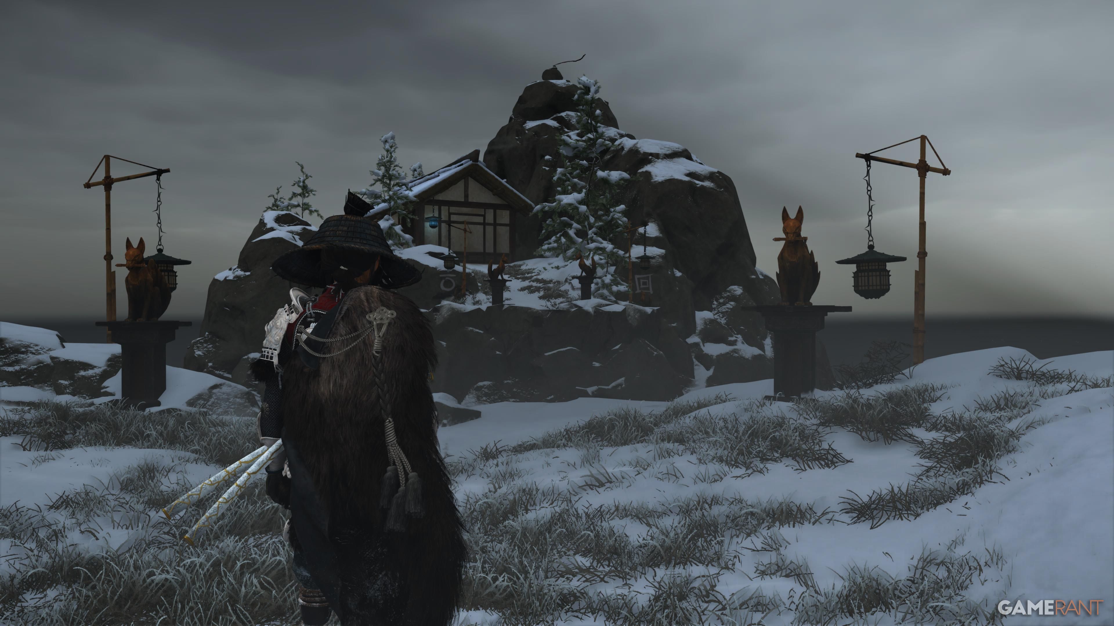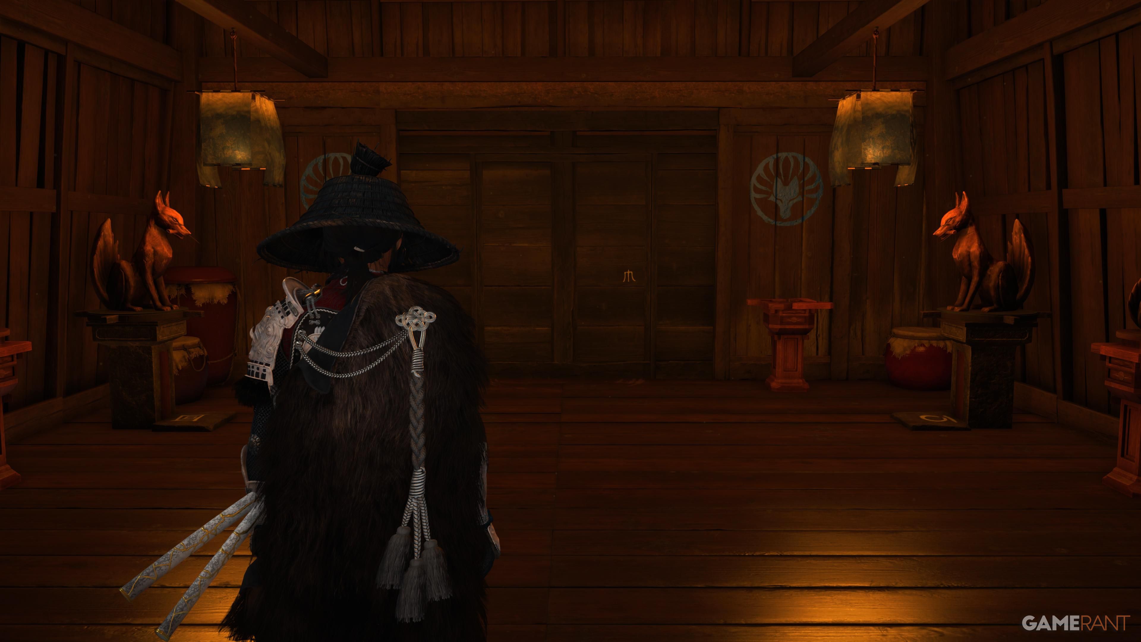 First, arrange the fox statues on the left so they are facing each other. This lets you pick up the statue in the center and move it onto the left pedestal. Repeat this process on the right side, making those statues face each other as well. After you place the second statue, you’ll be able to interact with the wall ahead, allowing you to pass through and reach the Hunting Camp Hideout.