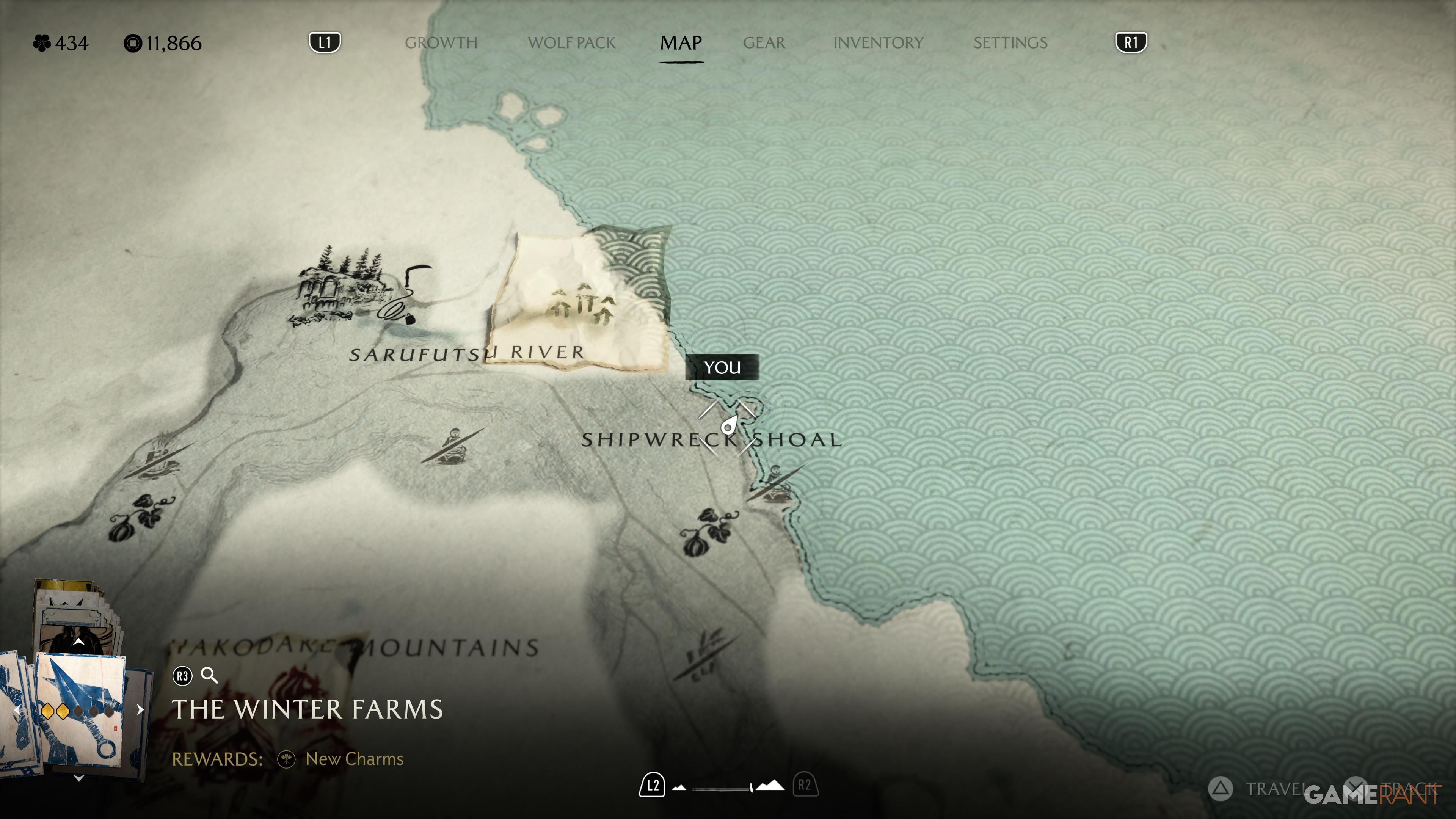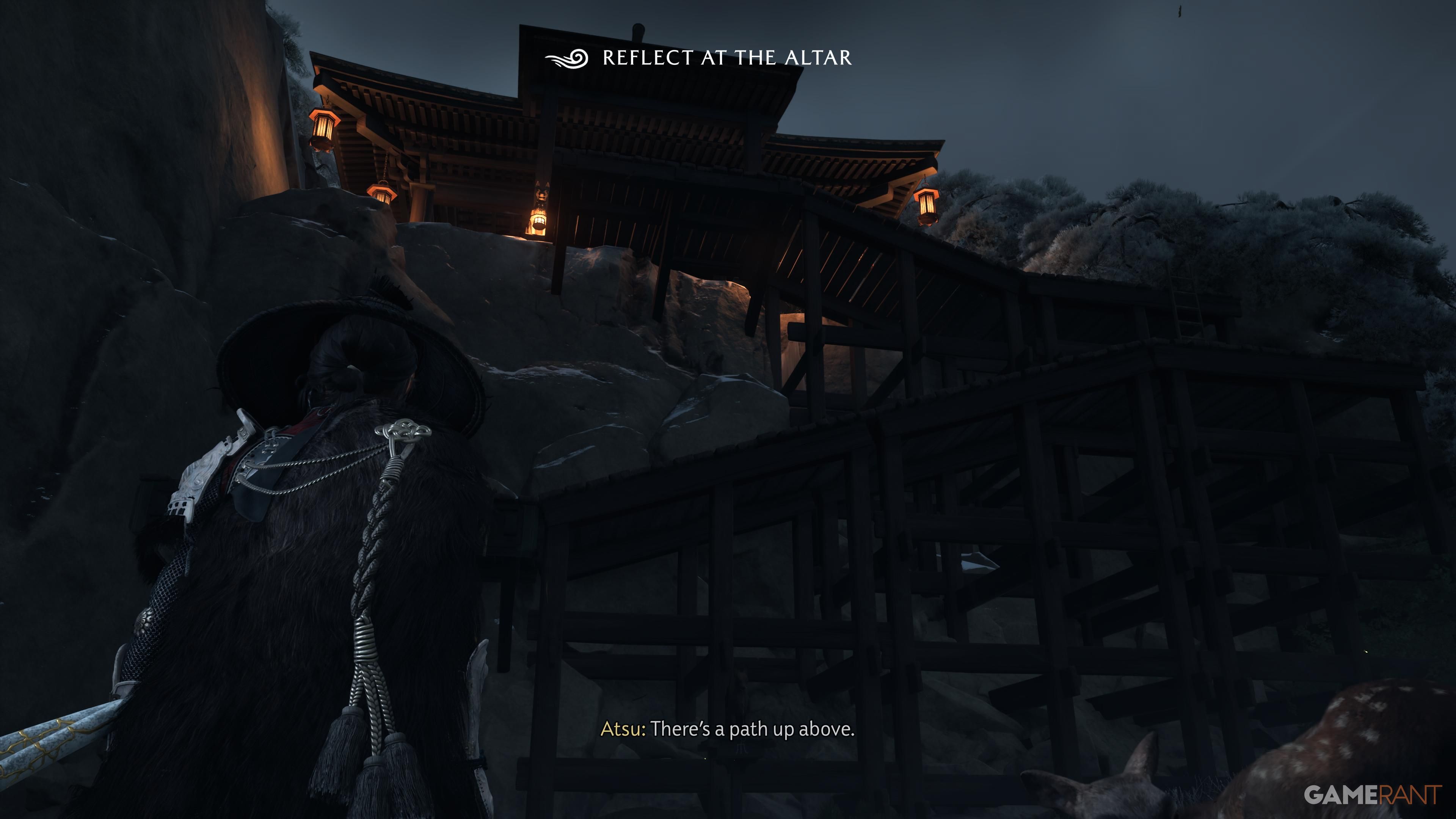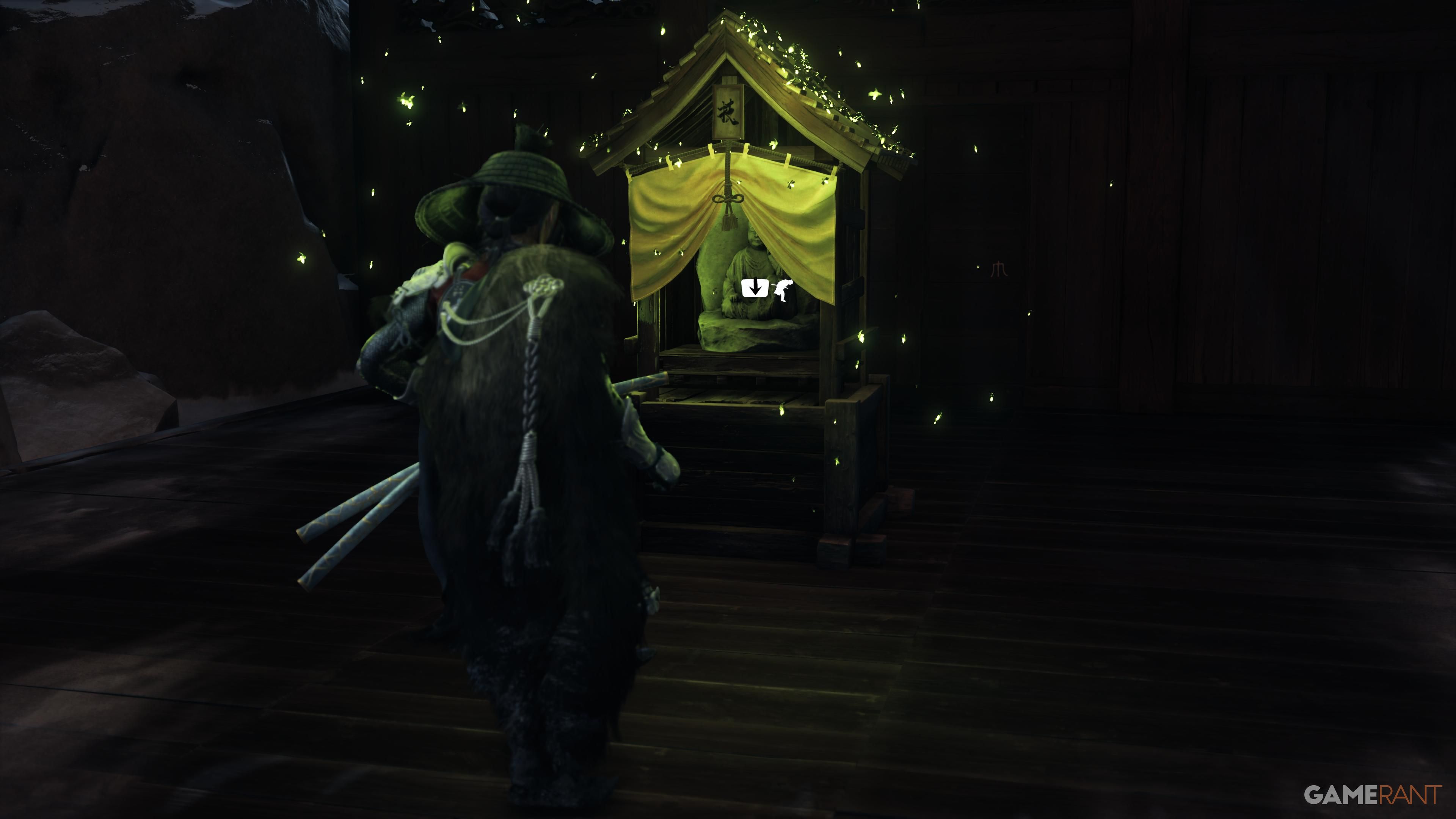 The puzzle isn’t finished yet – you still need to adjust two fox statues. This time, turn the left statue to face left and the right statue to face right, making them look away from each other. This will let you walk up to the wall and enter. Collect everything inside, and then pray at the Altar of Reflection to receive a free Skill Point. After that, take the scroll located on the left side of the room; it talks about the Sarufutsu Lighthouse and begins the The Encounters of the Wild side tale.