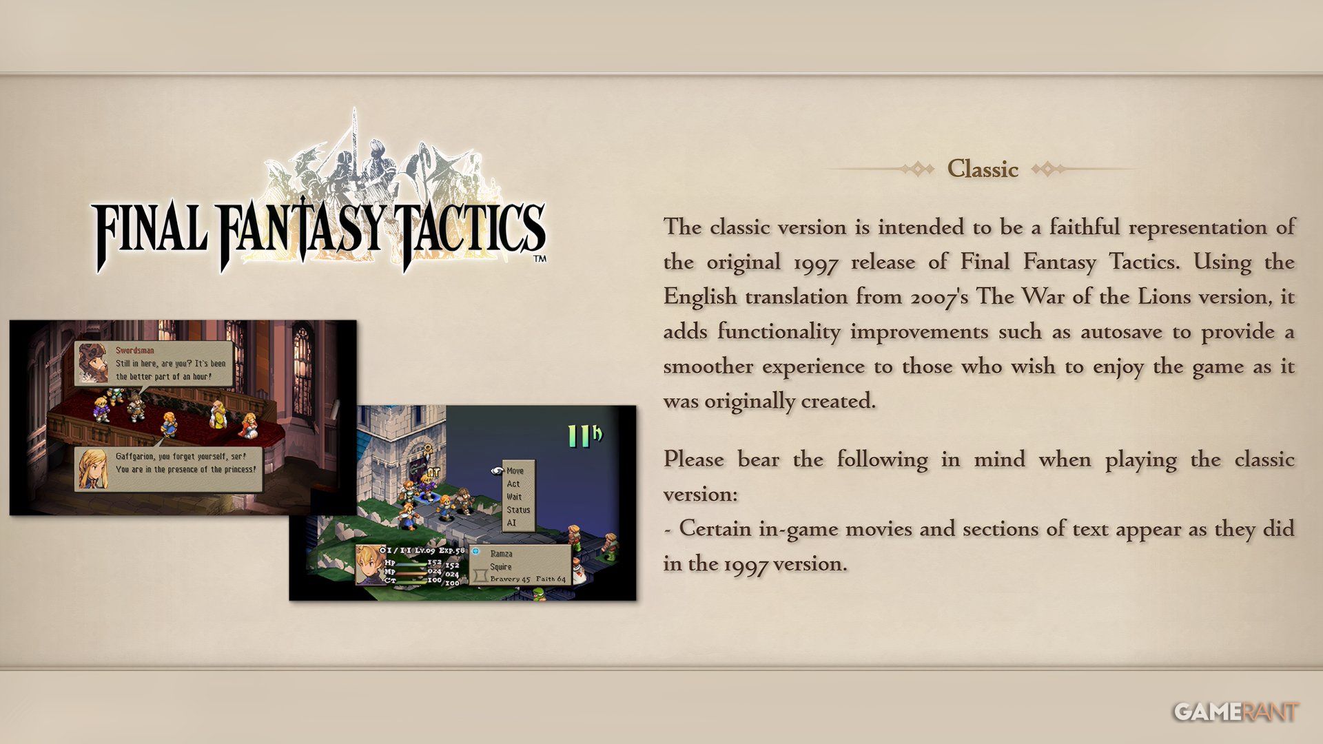 If you’re deciding which version to start with in this challenging tactical RPG, you’ll likely want to understand the differences. Classic mode will be very similar to the original game from 1998. However, the Enhanced version includes many quality-of-life changes designed to make FFT play more quickly and be easier to pick up.