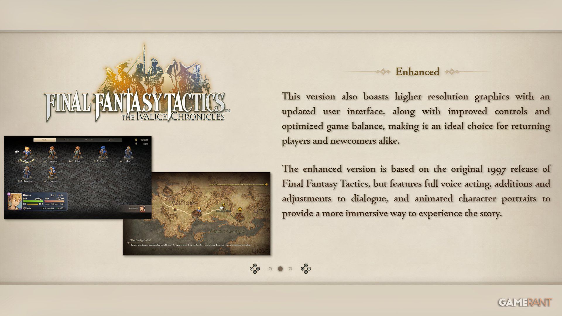 This is the remastered, high-definition version of Final Fantasy Tactics. We’ve enhanced the visuals and sound, and added animated character portraits and full voice acting. This version also removes all the changes that were included in The War of the Lions. Here’s a detailed list of all the improvements and updates in this version: