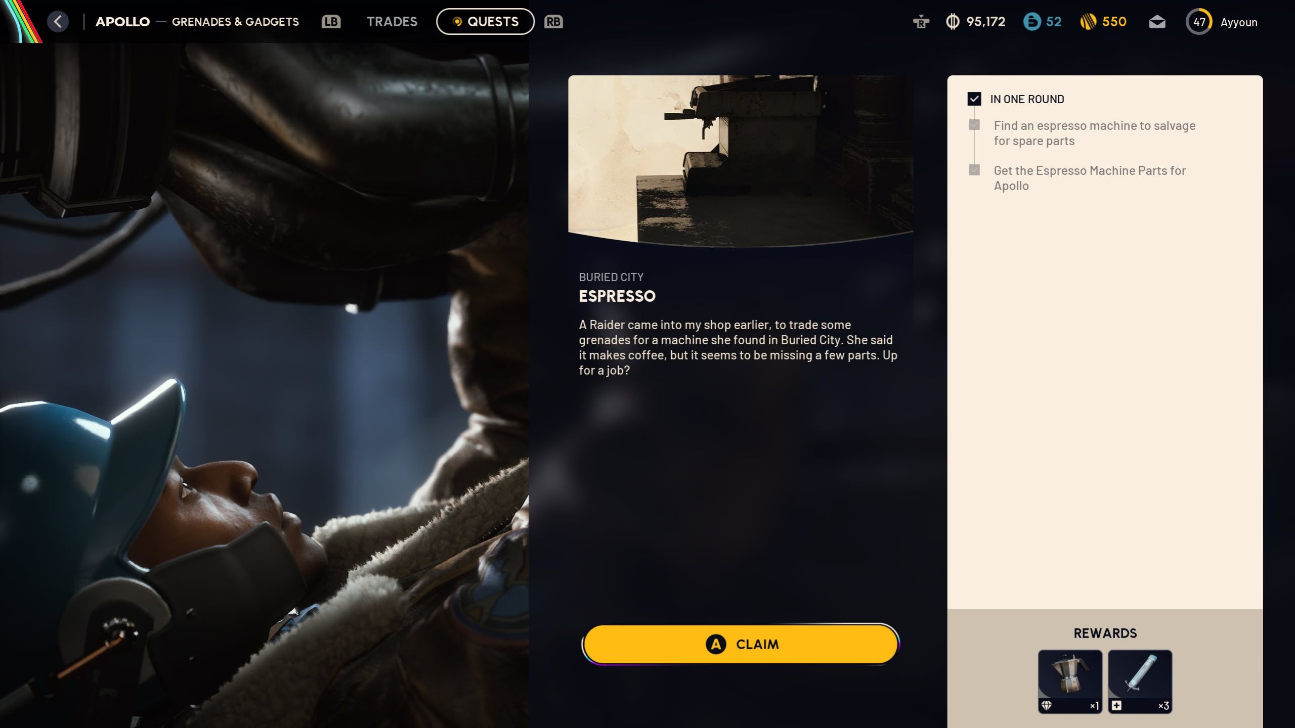 Once you’ve gathered all the espresso machine parts, bring them to Apollo in Speranza to finish the Espresso quest in ARC Raiders. You’ll get a Coffee Pot trinket and 3 Adrenaline Shots as a reward.