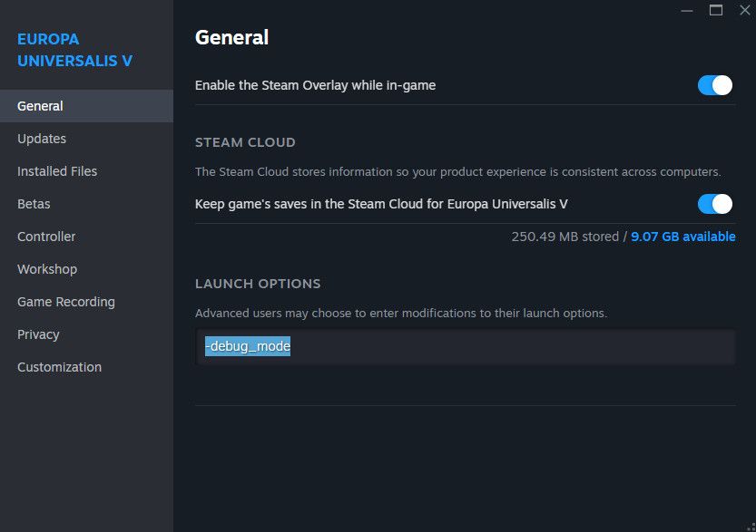 - Enter “-debug_mode” (without quotes) into the dialog box beneath Launch Options.