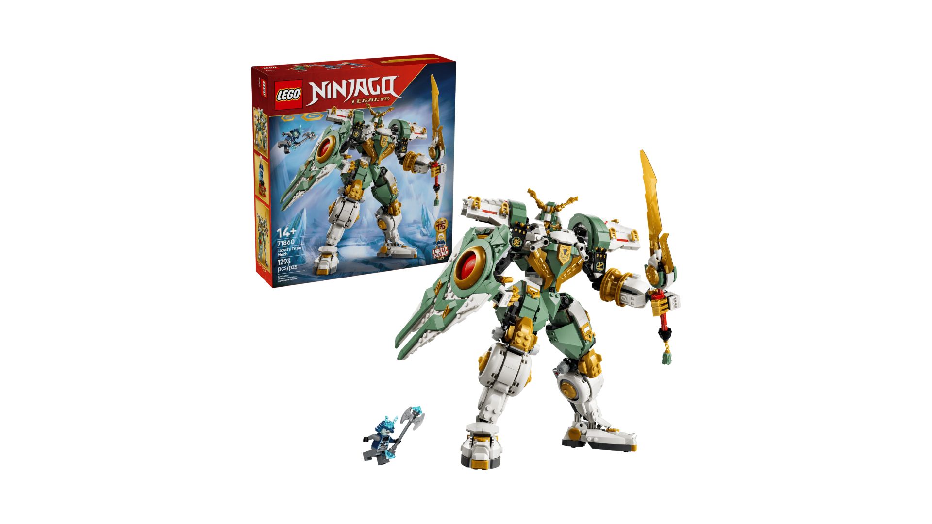 Image via LEGO The Lloyd’s Titan Mech 15th Anniversary set (#71860) is a large and impressive build with 1,293 pieces, priced at $129.99. This updated version of a popular mech features improved armor, greater movement, and a huge sword and shield. The shield cleverly transforms into wings, making it fun to play with and great to display. It comes with minifigures of Lloyd and Grimfax, connecting the build to the world of NINJAGO and making it a special commemorative set.