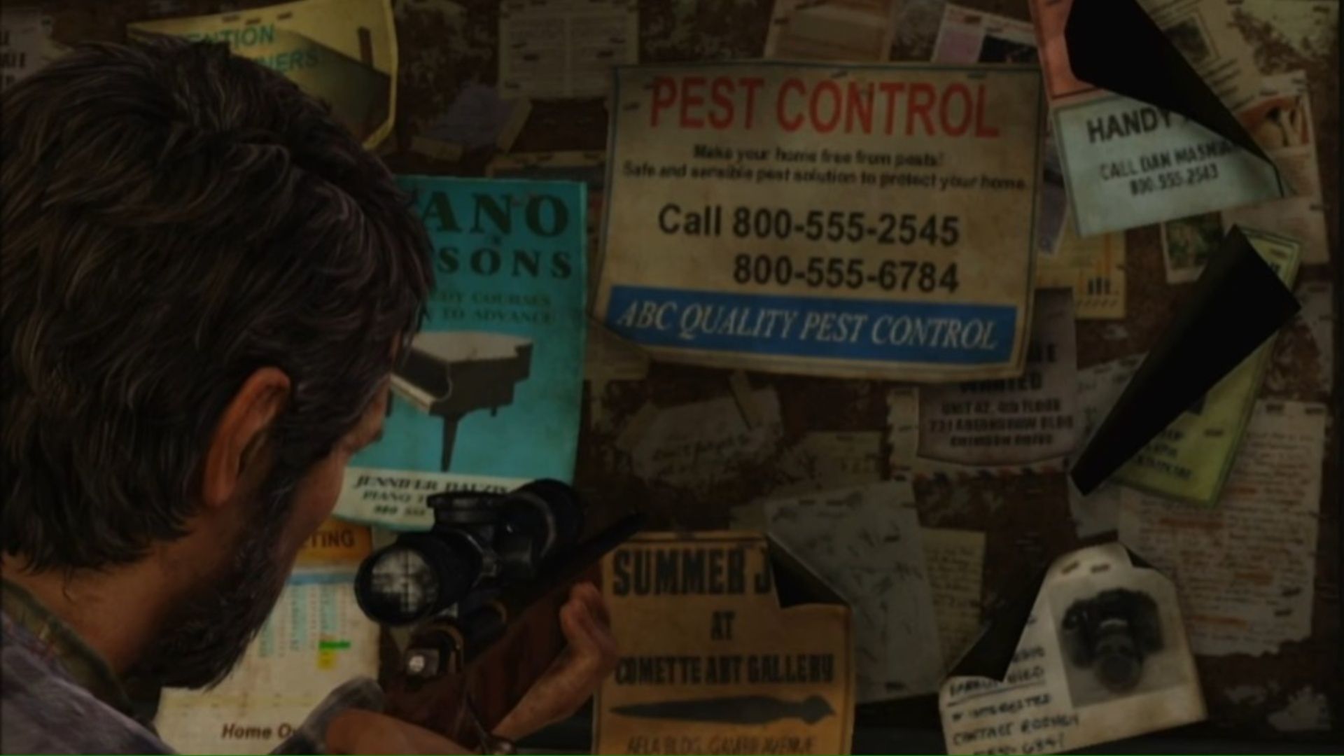 The Last of Us is a tense and frightening game set after a devastating apocalypse. It tells the story of Joel and Ellie as they travel across the country from Boston to Seattle. Throughout their journey, players can discover bulletin boards covered in notes and flyers, including one with a phone number for pest control.