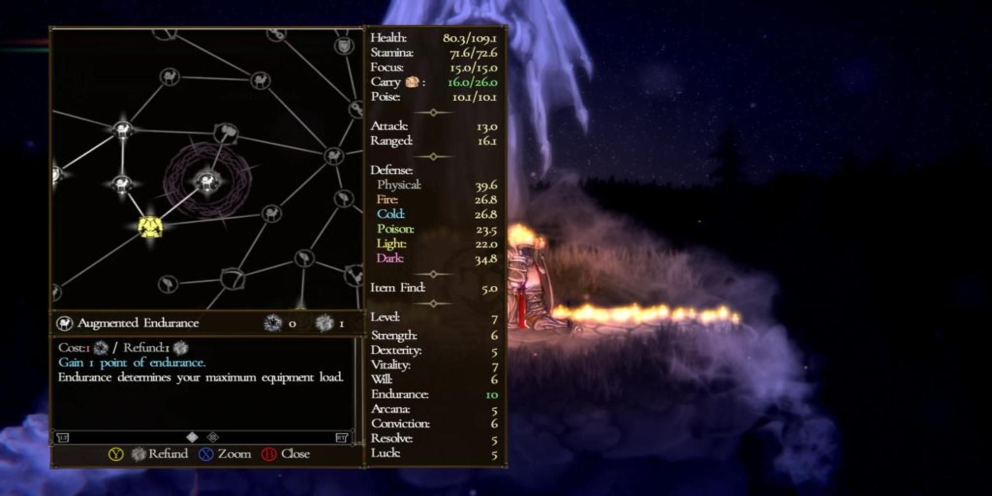 Salt and Sanctuary borrows the challenging battles of Dark Souls and presents them in a large, 2D skill system. Rather than a simple skill tree, it uses a complex network similar to the Sphere Grid in Final Fantasy X. Each time you level up, you move just one step on this extensive map, gaining access to improvements for weapon skills, class abilities, or small stat increases.
