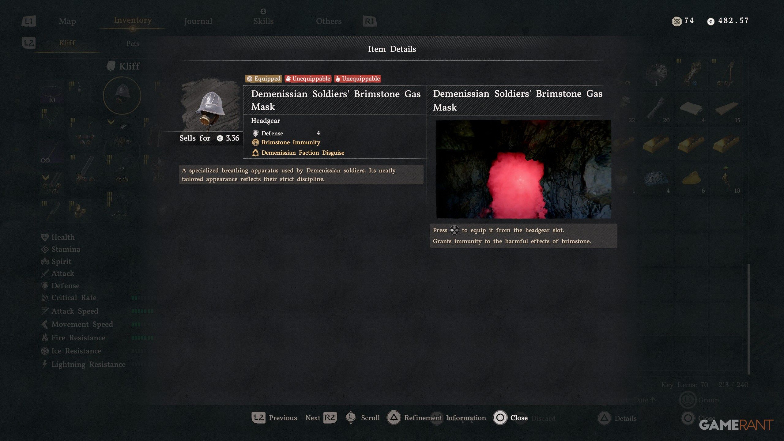 - Once you purchase the Demenissian Soldiers’ Brimstone Gas Mask, you can equip it and enjoy the passive effects of gas immunity.