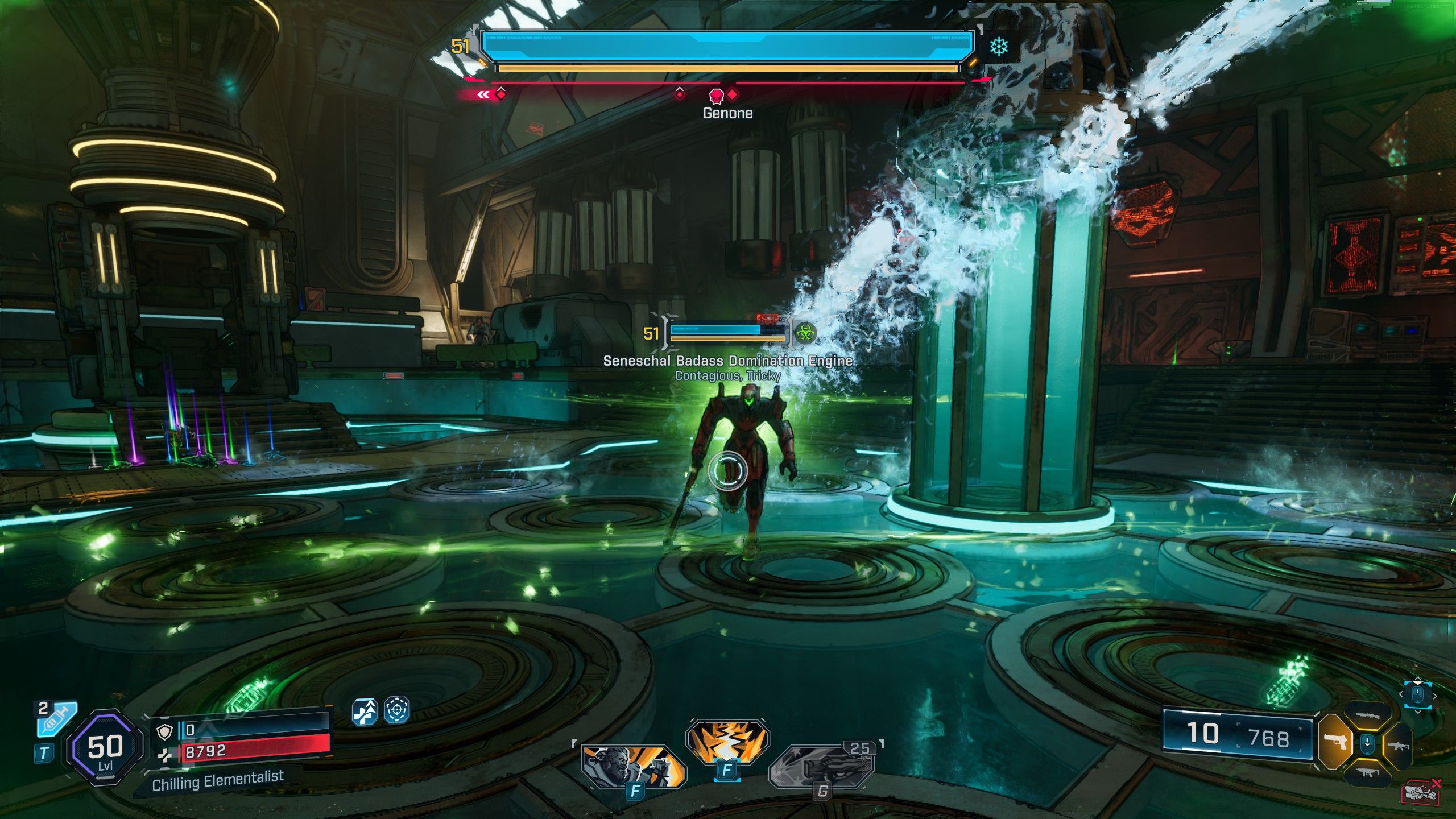 Genone is a relatively simple boss fight. His first health bar is a Shield, which can be quickly defeated using Shock attacks. His second health bar is Armor, so Corrosive or Cryo damage will work best. Although Genone has support from his Order troops, they’re not difficult to eliminate. Genone’s attacks deal splash damage, but you can easily avoid taking damage by staying mobile.