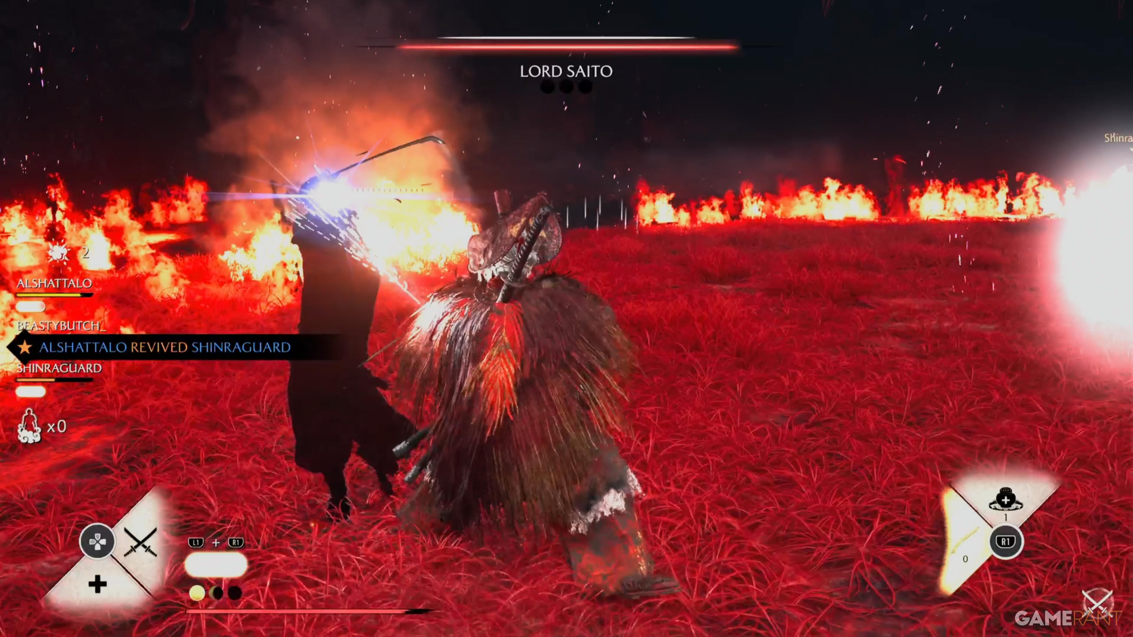Throughout the animation, keep hitting the boss to build up the stagger meter and reduce his health. The rest of the battle follows the same pattern: Lord Saito will summon smaller enemies, allowing you to defeat them and recover Spirit energy for healing.