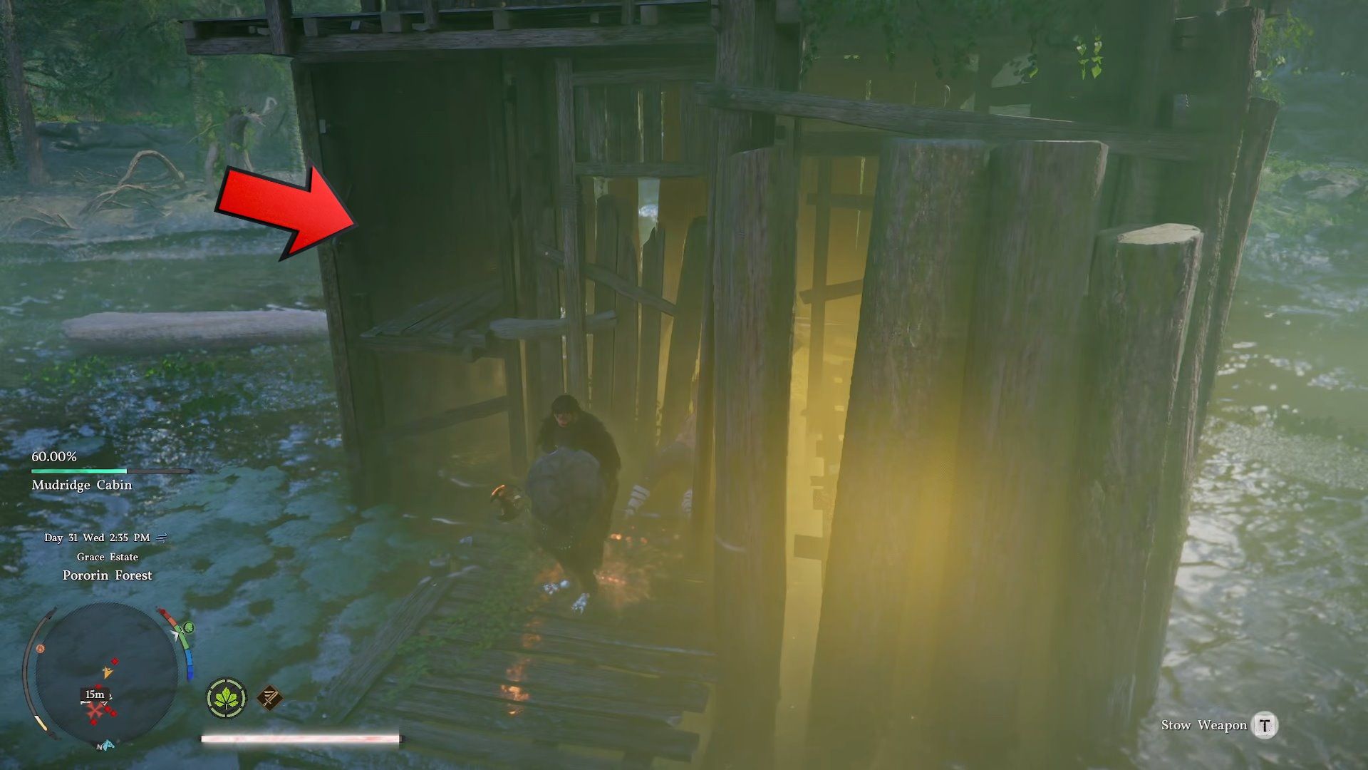 - Head east, past the Sanctum of Temperance, to the location marked on the map above to reach the Mudridge Cabin.