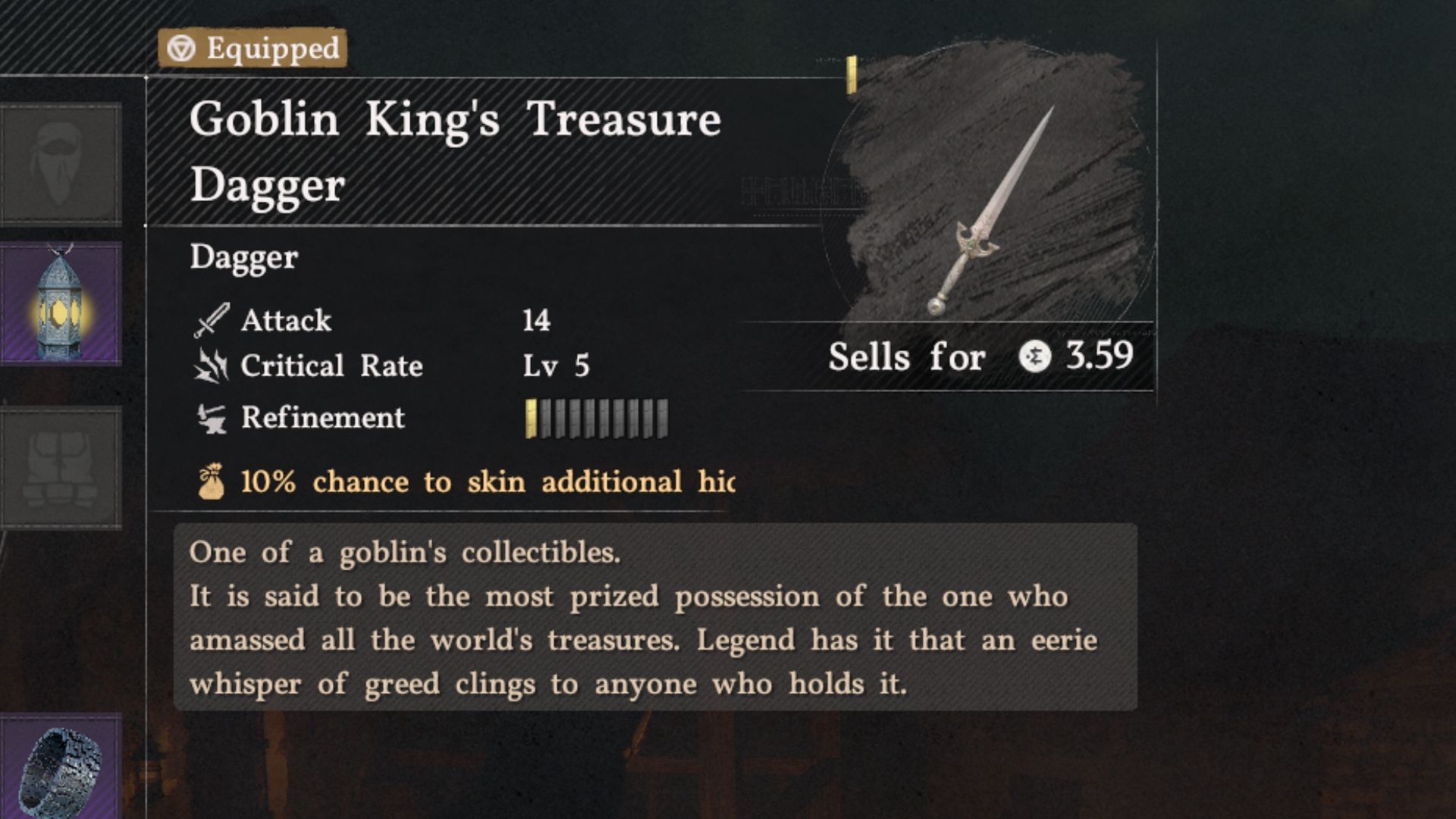 Daggers in Crimson Desert aren’t typically used for fighting, so they function more as tools than weapons. The Goblin King’s Treasure Dagger stands out because it gives you a 10% chance to get extra hide whenever you skin an animal – a helpful bonus that makes it better than most other daggers. This dagger is special, and its ability is part of the dagger itself, not something added from Abyss Gear.