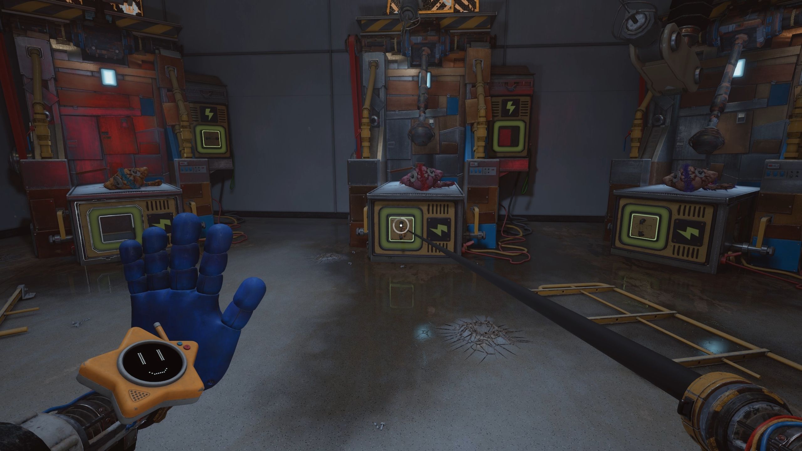 Begin on the side of the room where the three sewing machines are grouped together. Use one of the Grabpack hands to hold onto the electrical panel near the doorway, and the other to grip the magnetic surface. This will allow you to climb onto the first sewing machine.