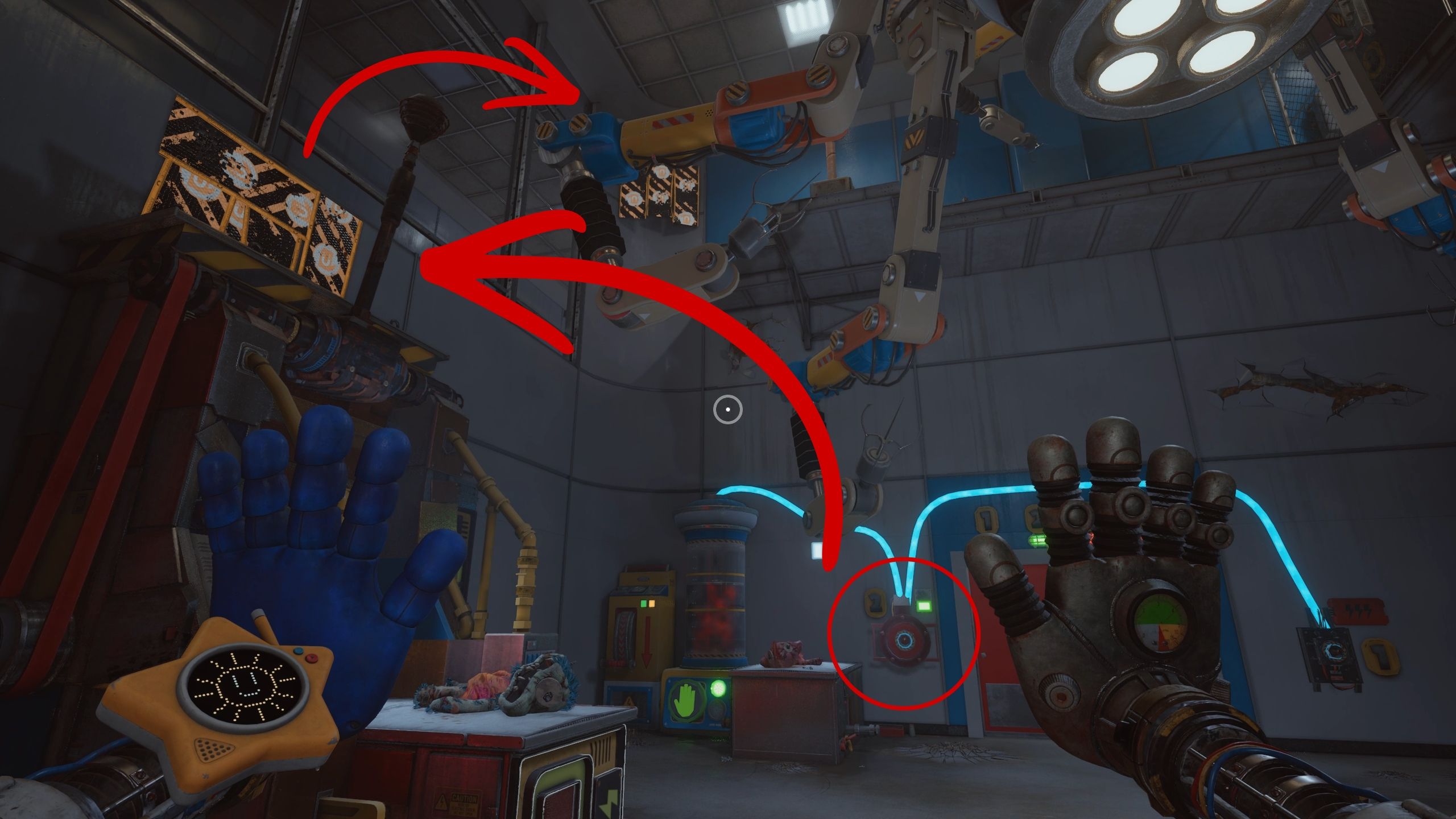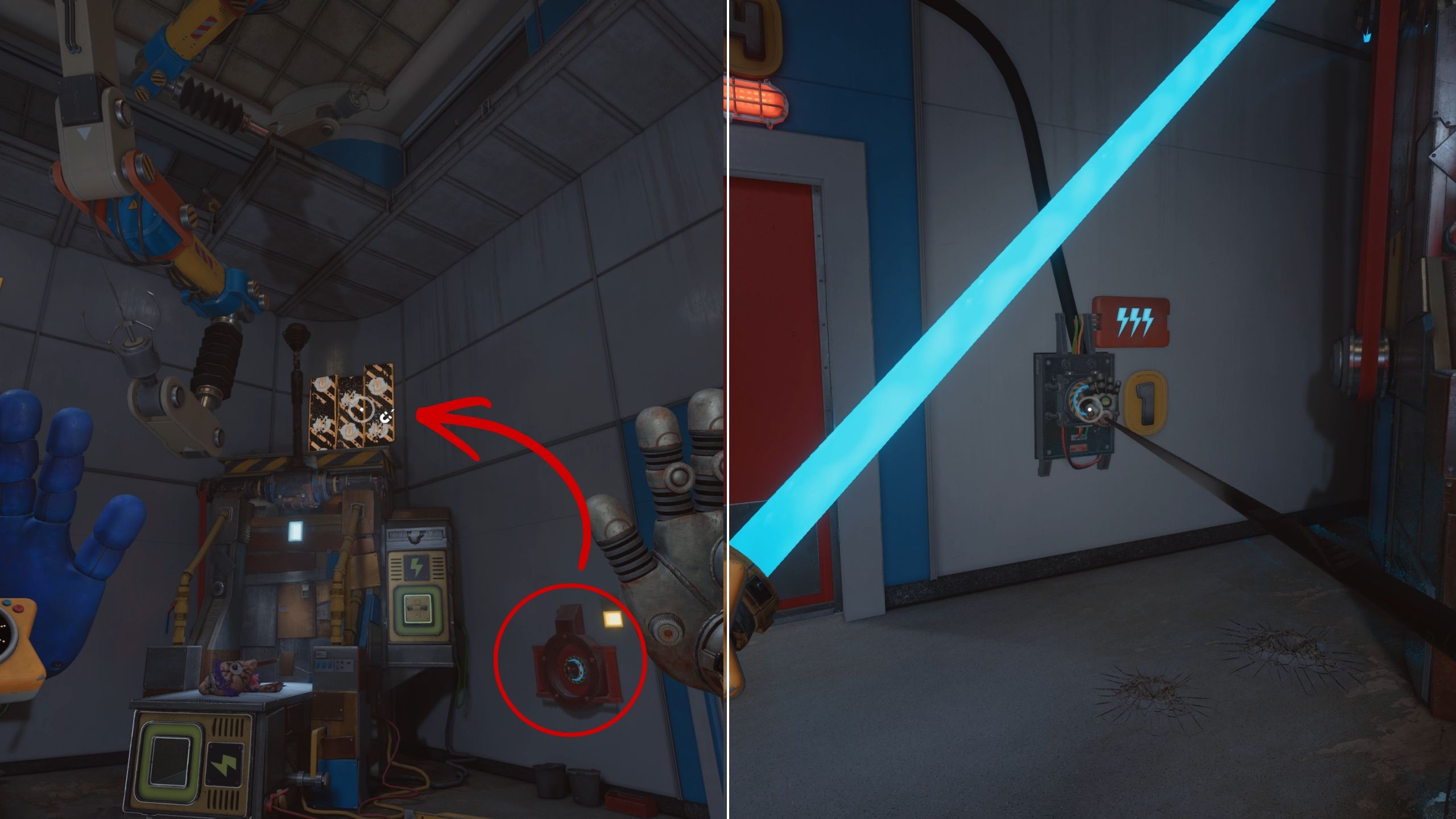 With the second power source running in Poppy Playtime: Chapter 5, use one of the Grabpack hands to conduct electricity and the other to grip the magnetic wall. This will allow you to reach the stitching station on the left.