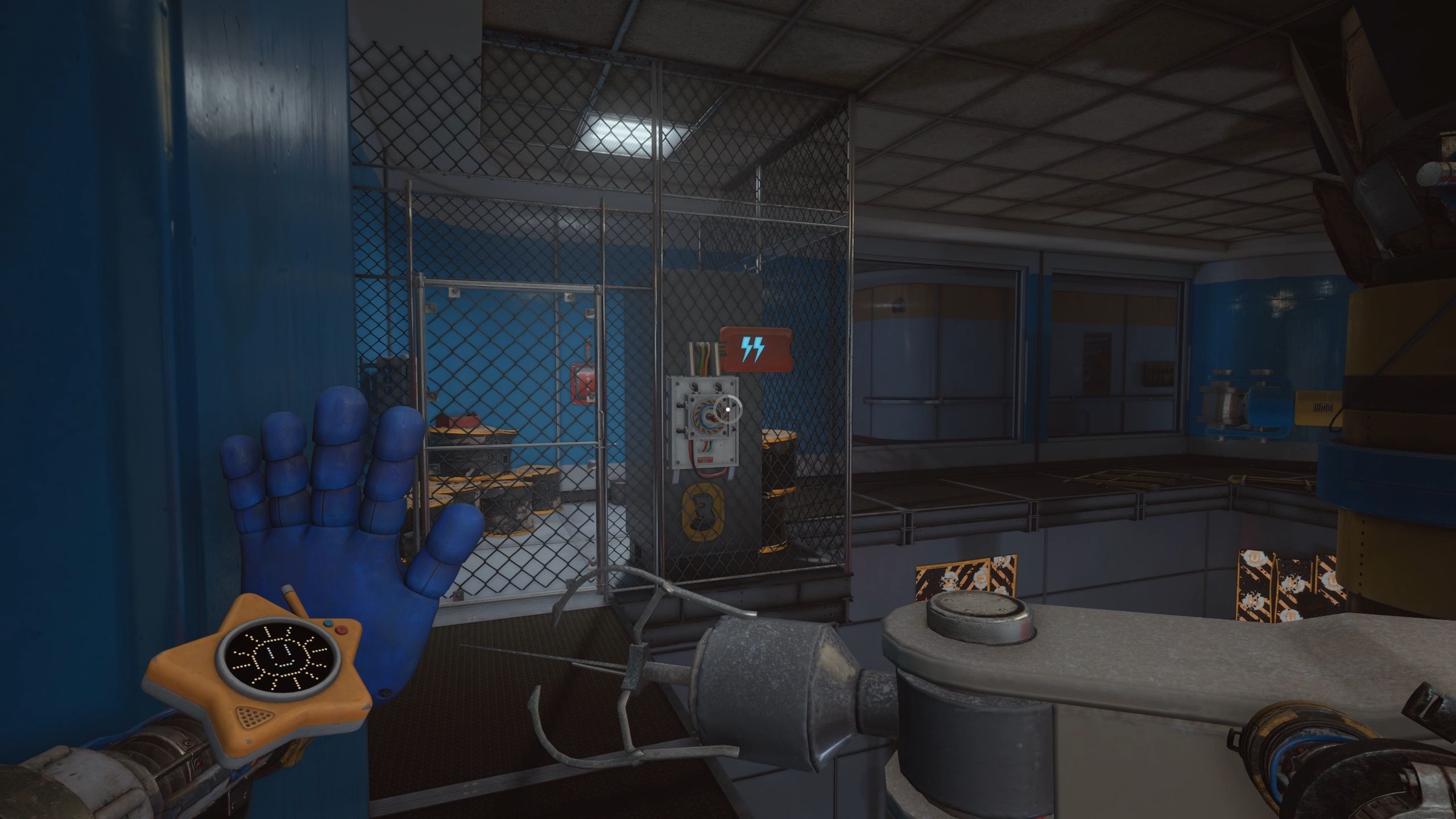 After wrapping GrabPack’s wire around the power node on the stitching station, use your second hand to reach the upper platform and power the second node. With both nodes powered, use your free hand to interact with the panel on the chain-link door, opening it and activating the third power source within the Grand Stitchery.