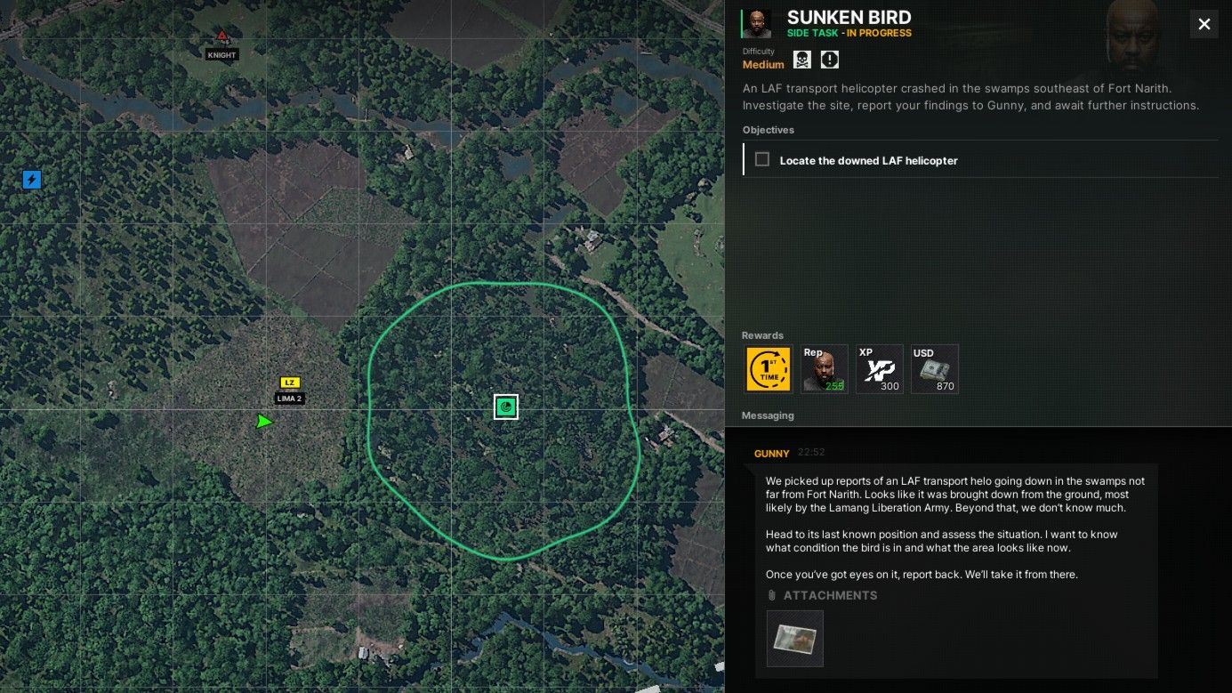 Okay, so in Gray Zone Warfare, there’s this side mission called Sunken Bird. You can start it once you’ve unlocked the YBL-1 area. I got it from Gunny, and honestly, he’s a lifesaver! He gives out a ton of missions, which is awesome if you’re trying to level up fast – he’s probably the easiest vendor to grind with.