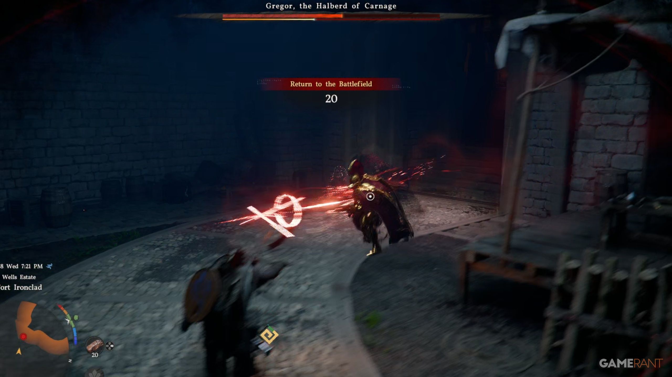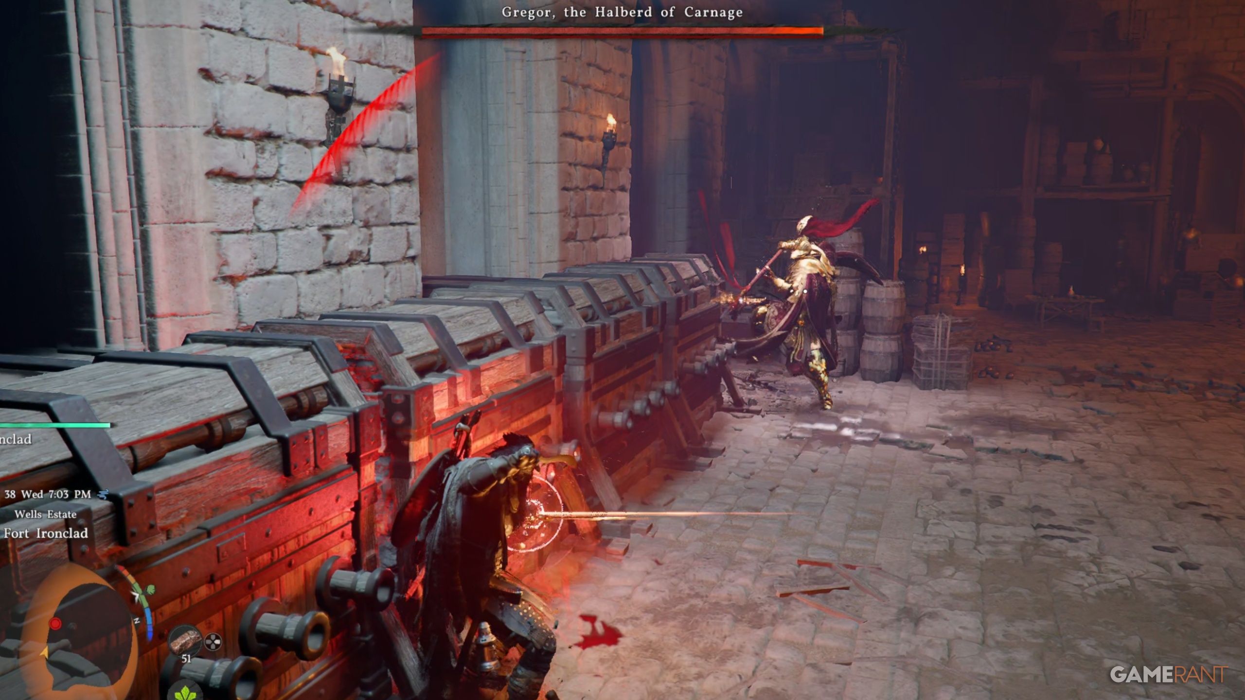 - Block Gregor’s attacks, as his halberd weapon will destroy the cannons in a few hits, rendering half of the arena now accessible without cannon fire.