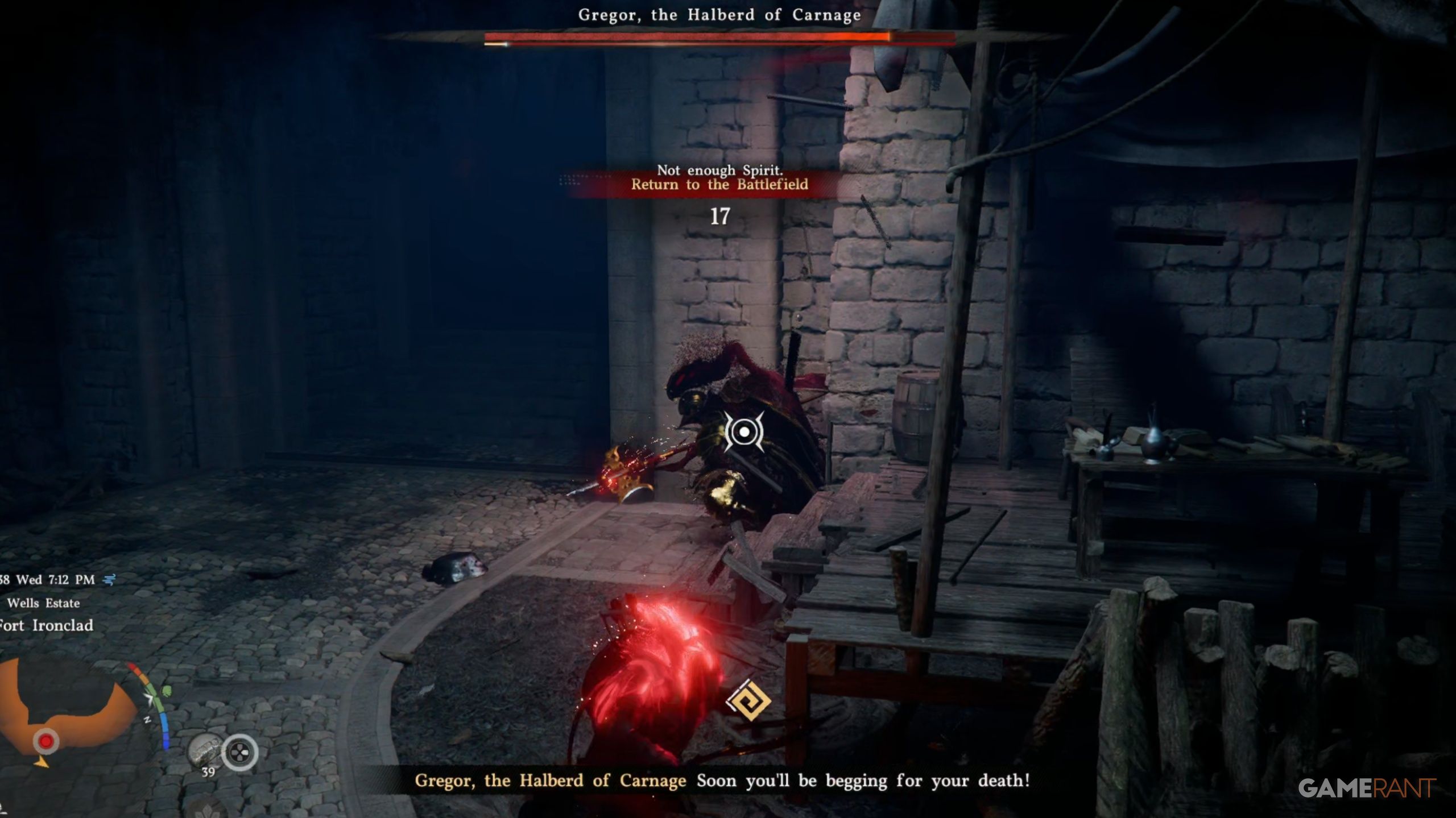 Here’s a helpful hint for the fight: you don’t need to clear out the entire castle – just the boss arena. When the fight starts, Gregor usually stays inside, giving you a safe zone to recover health and Spirit. This area is also ideal for avoiding his powerful, invulnerable spear attack. If he uses it in the courtyard, he won’t target you while trying to return to the arena.
