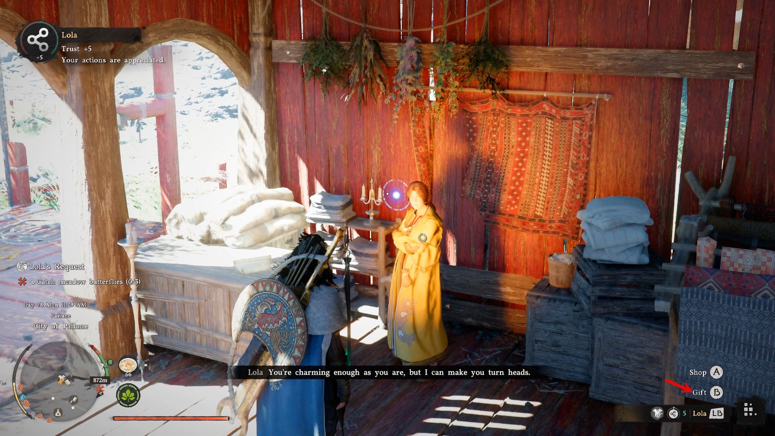 You can build trust with Lola by talking to her and giving her gifts. She especially likes Copper Pouches, which you can earn by defeating weaker enemies in Pywel. Each pouch will increase her trust by 5 points, and you’ll need to give her between 18 and 19 pouches to max out her trust level.
