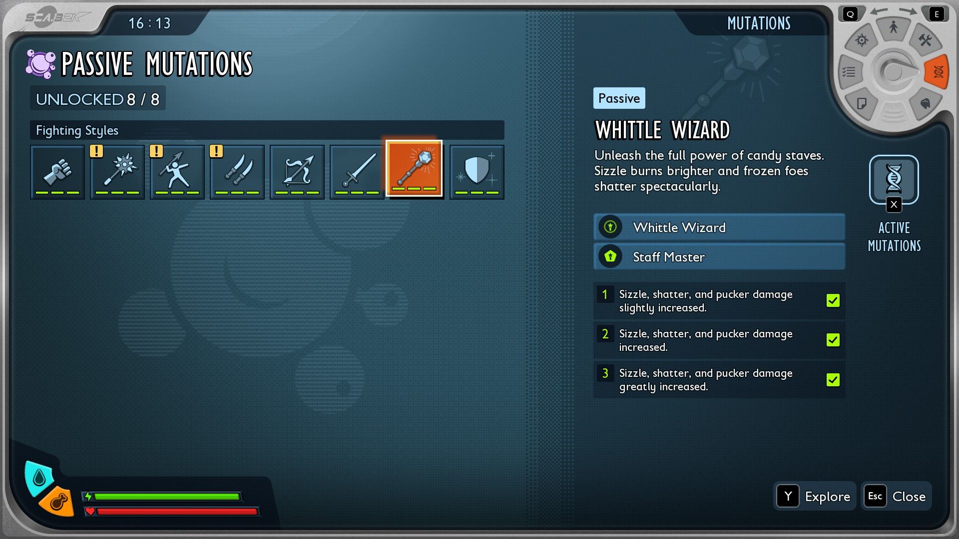 The Whittle Wizard mutation, which changes how Candy Staffs work, is now always active as a passive ability whenever you hold a Staff. To unlock and improve this passive, you need to defeat 40, 100, or 200 creatures with a Staff, depending on the rank. Here’s what each rank does: