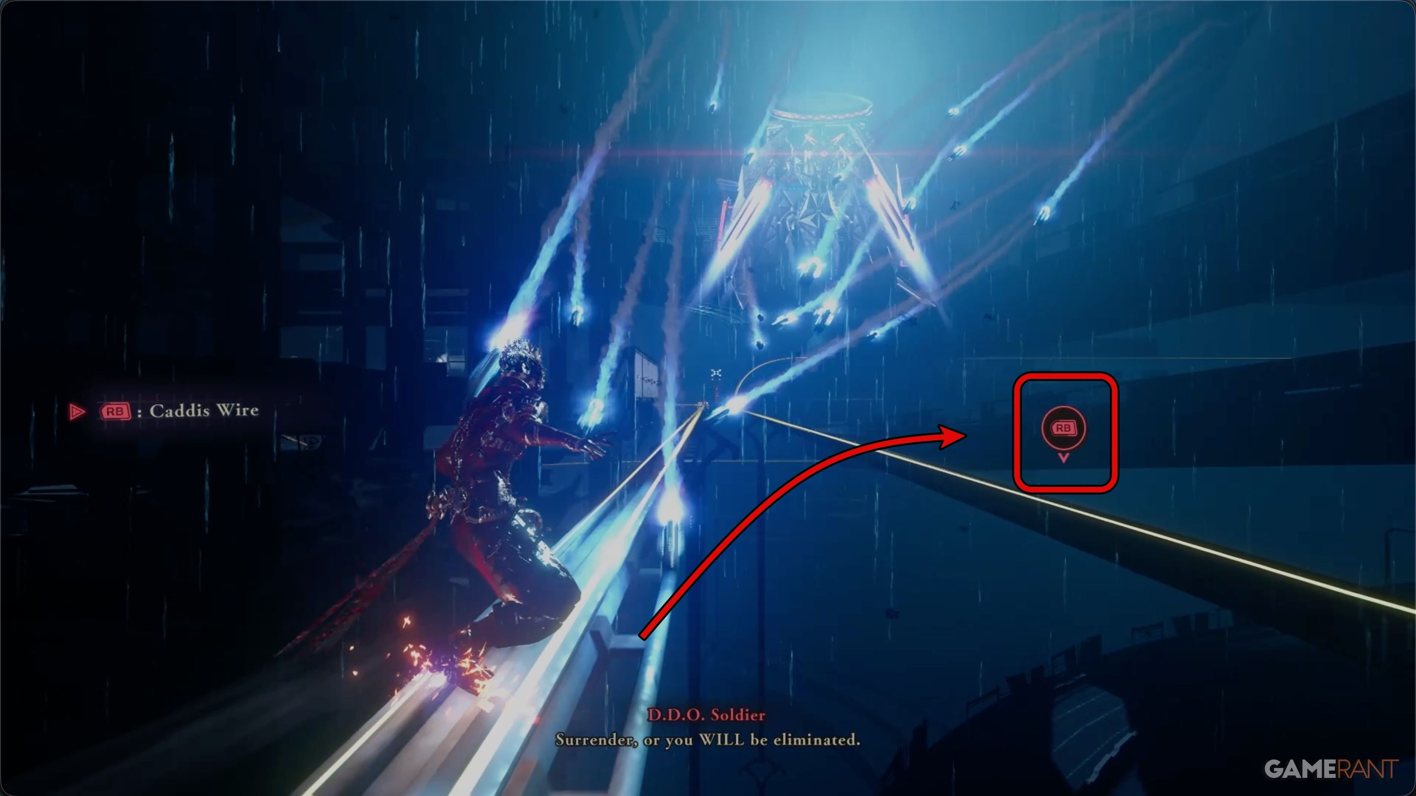 Right after you go through the door, you’ll encounter two simple enemies. Once you’ve defeated them, jump onto the rail and get ready for a new challenge. A ship will start shooting rockets at you. When that happens, quickly jump to the next rail by pressing RB (on Xbox) or R1 (on PlayStation).