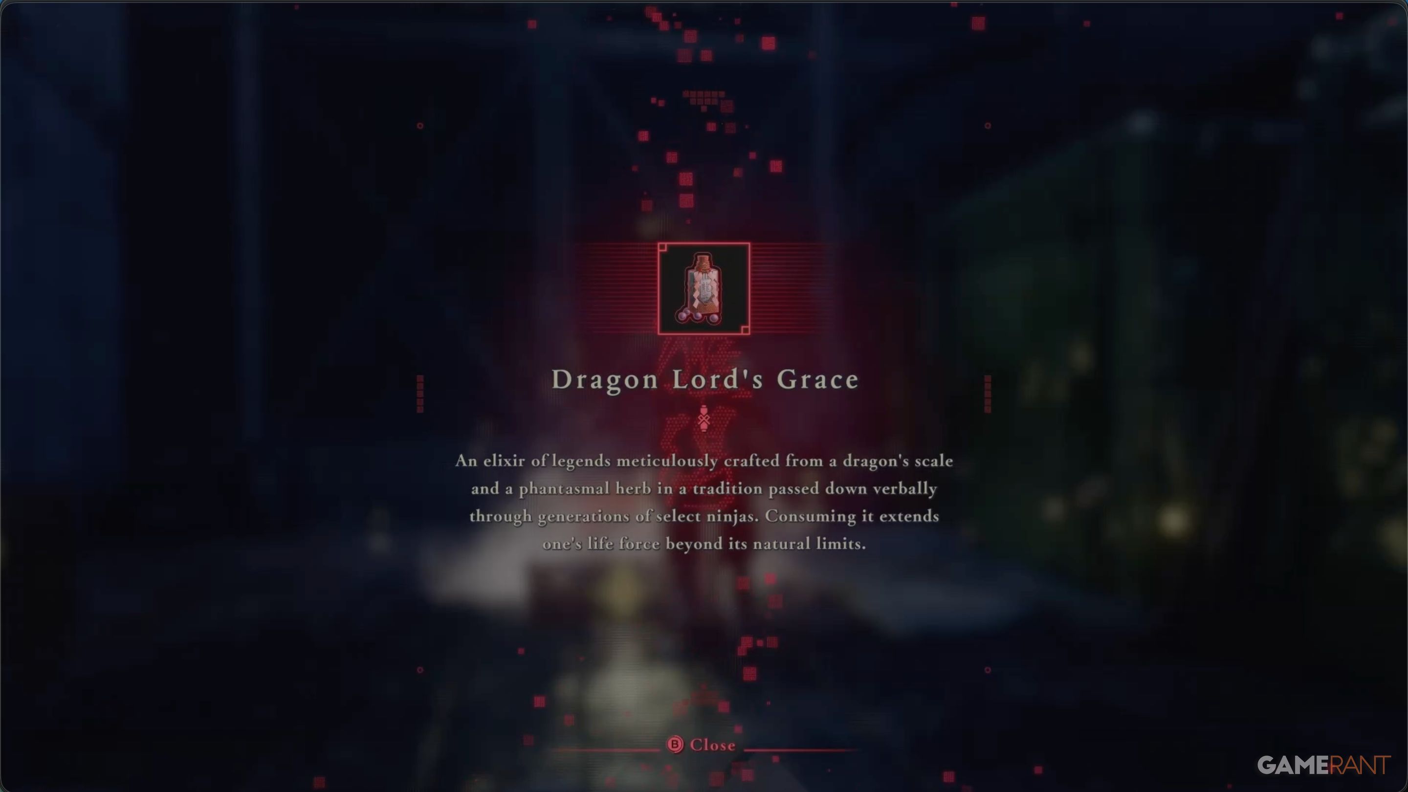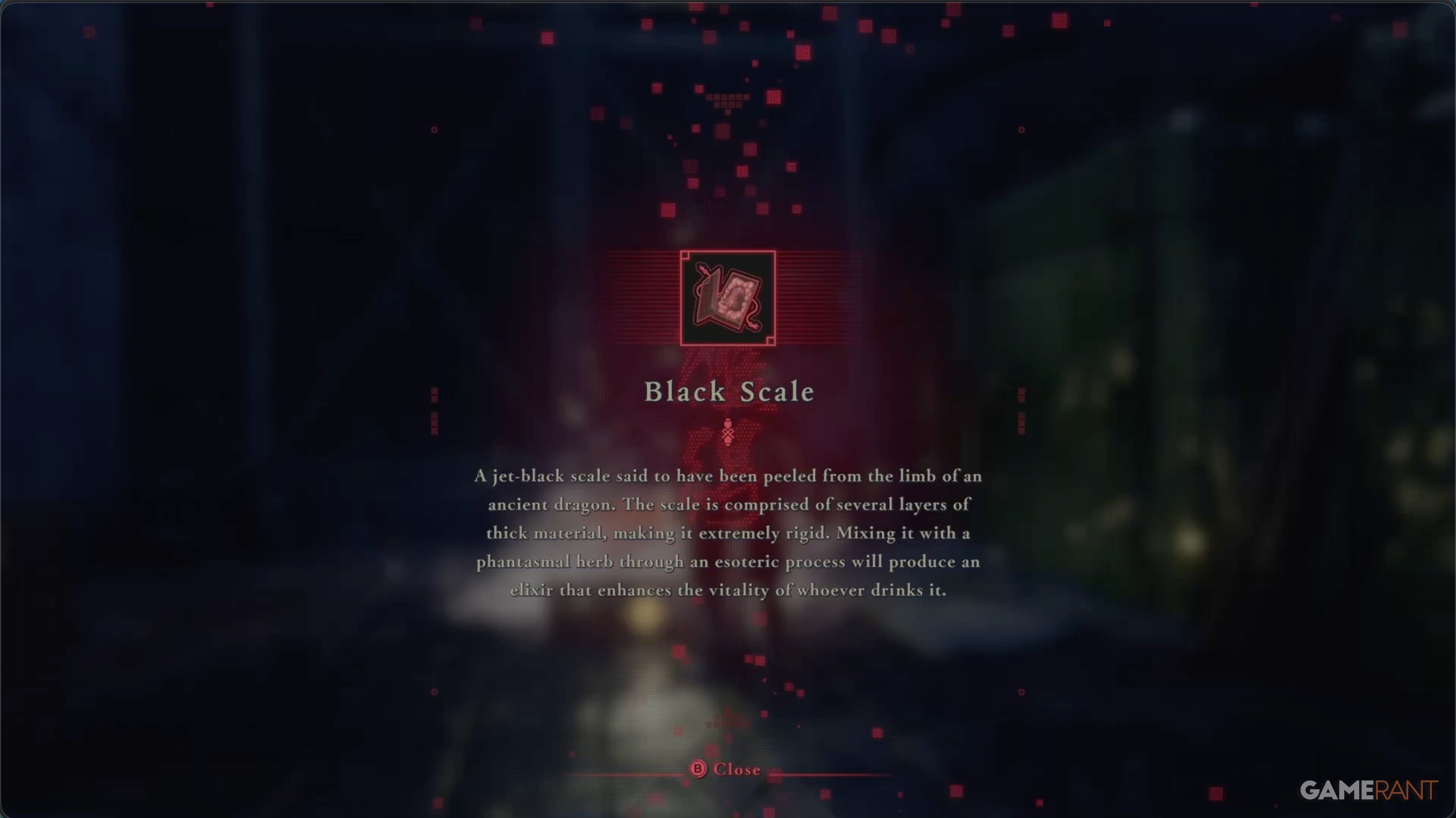 You’ll find the first Black Scale in Chest 3. Combine this with a Phantasmal Herb to create the Dragon Lord’s Grace. Once you have both, the game will automatically combine them, using the Dragon Lord’s Grace to permanently increase Yakumo’s maximum health.