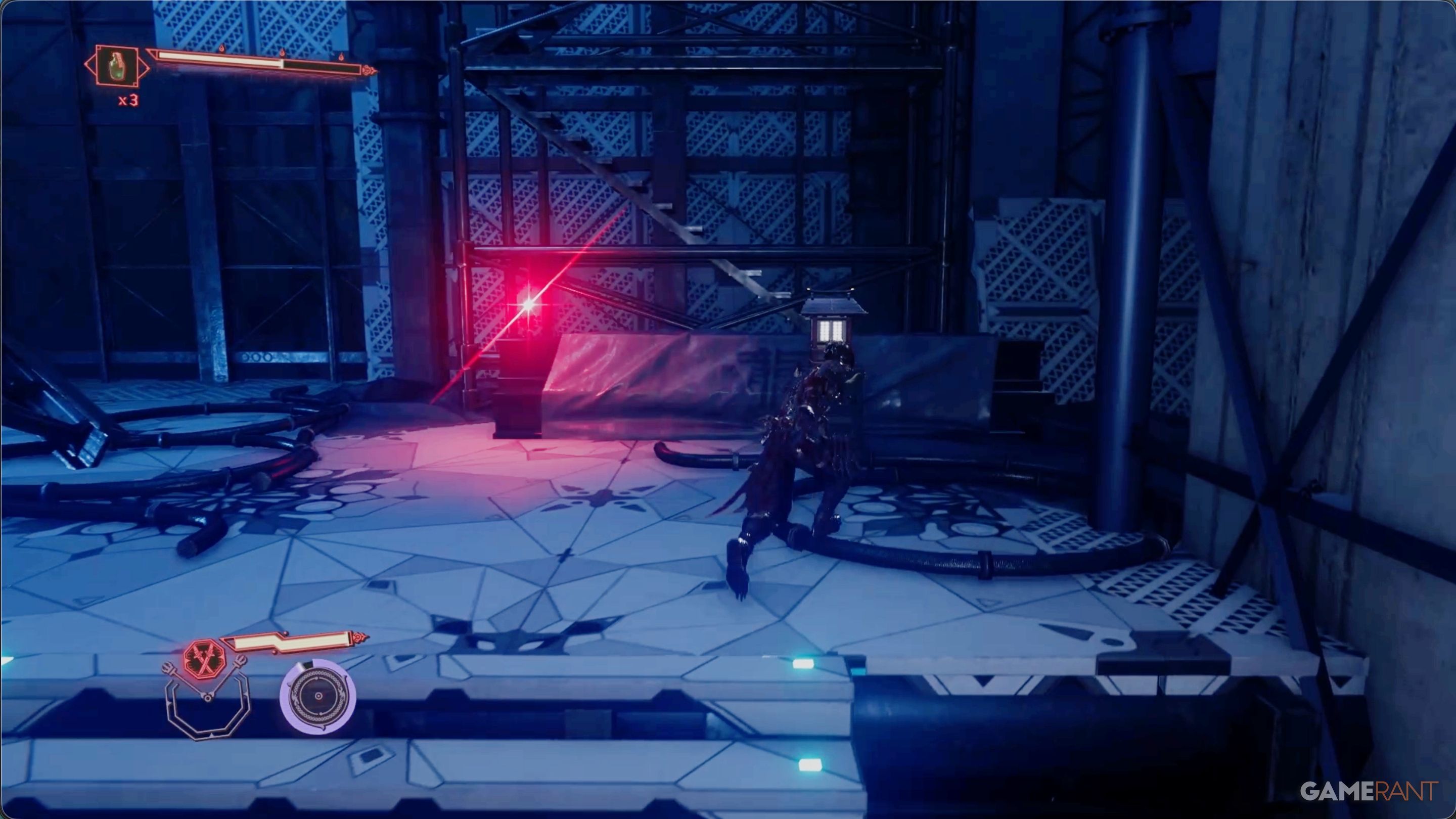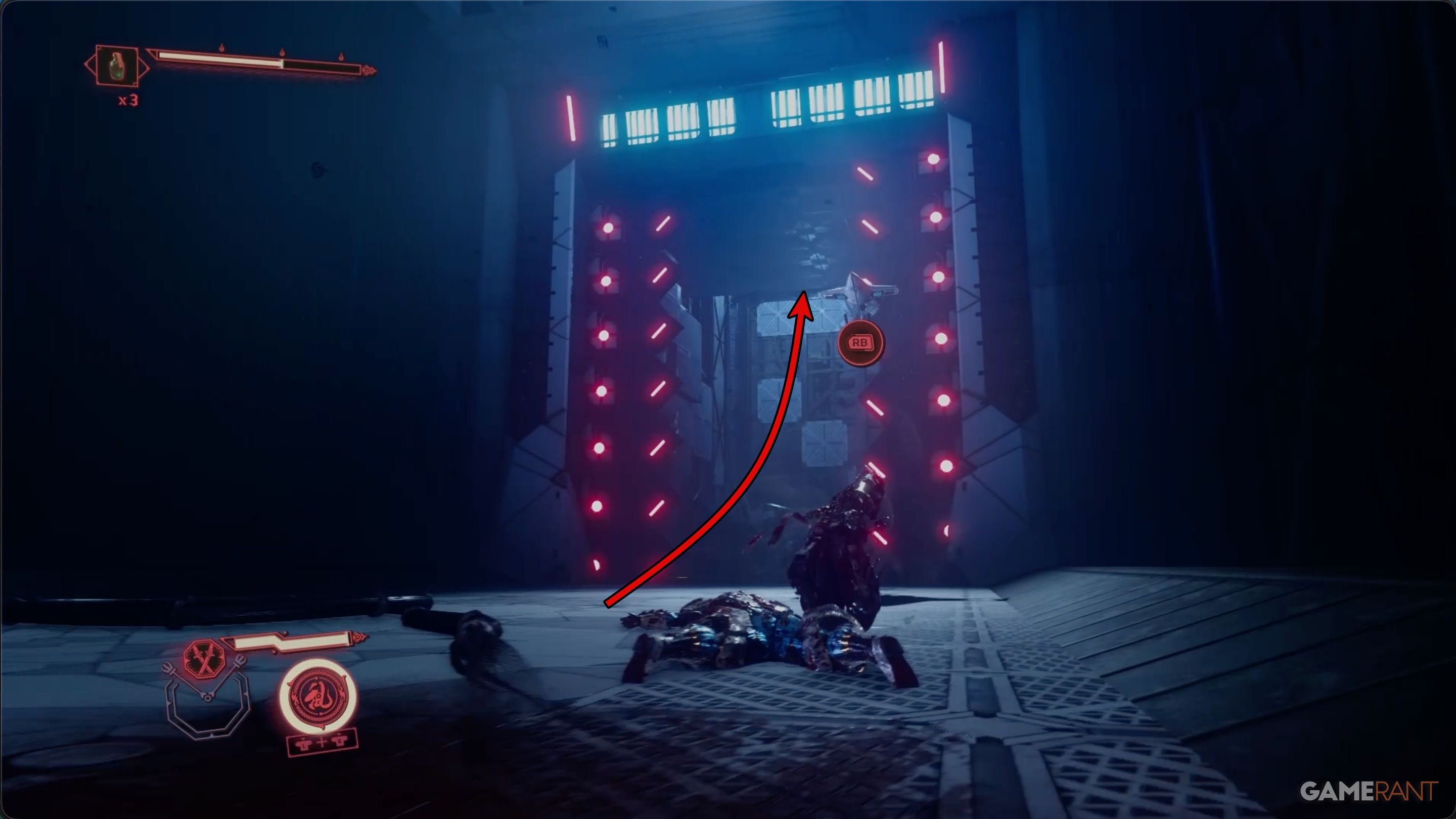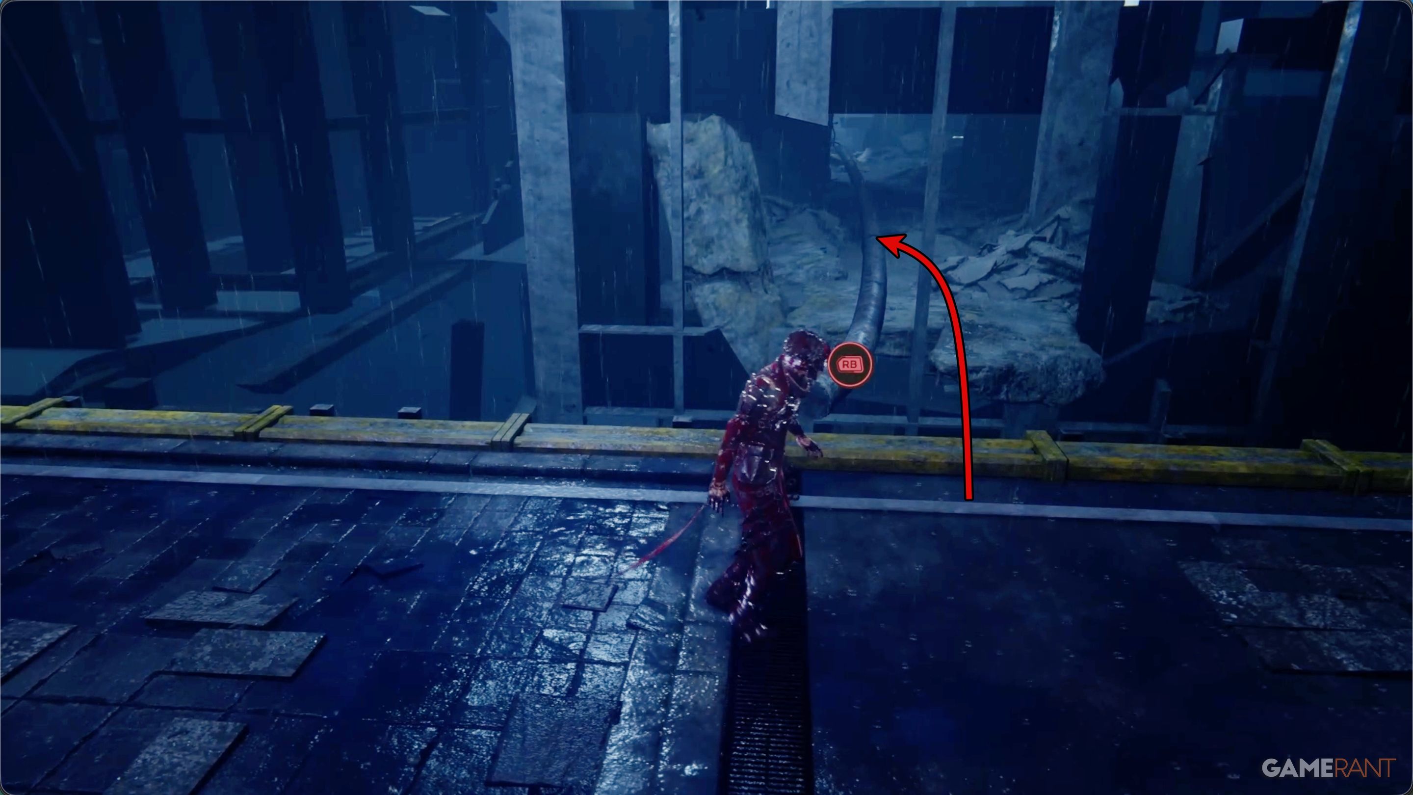 Once you finish the Purgatory Gate, you’ll return to the courtyard where you found the first two chests. Immediately after getting Chest 3, head back up to the rooftop rail. Use the RB/R1 button to jump onto the rail and continue to the next battle area.