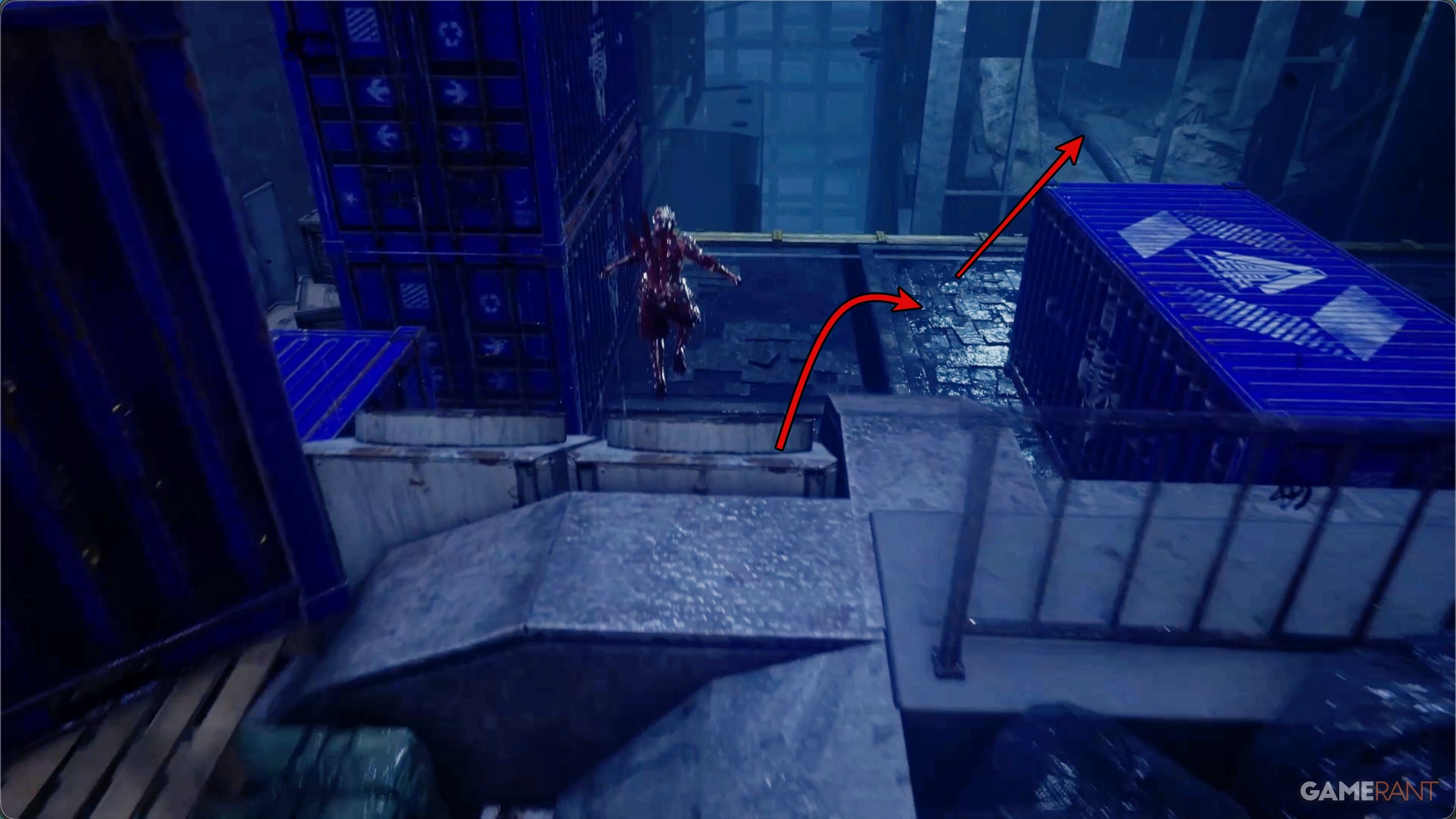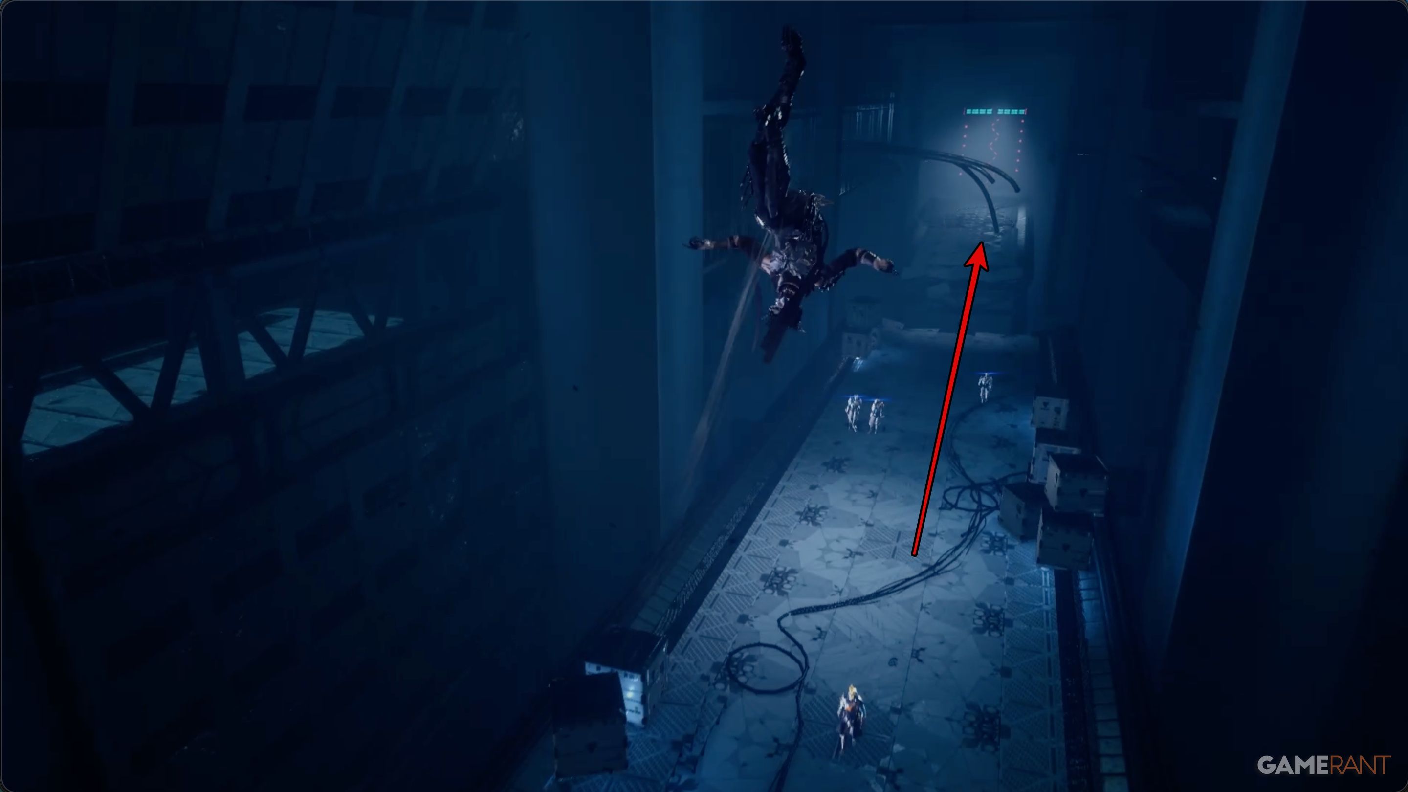 After exiting the first DarkNest Terminal, you’ll face a series of battles where you can start grappling onto combat drones. This fight happens in a large, multi-level area with both rooftop and ground combat. Keep an eye out for three chests hidden throughout the area.