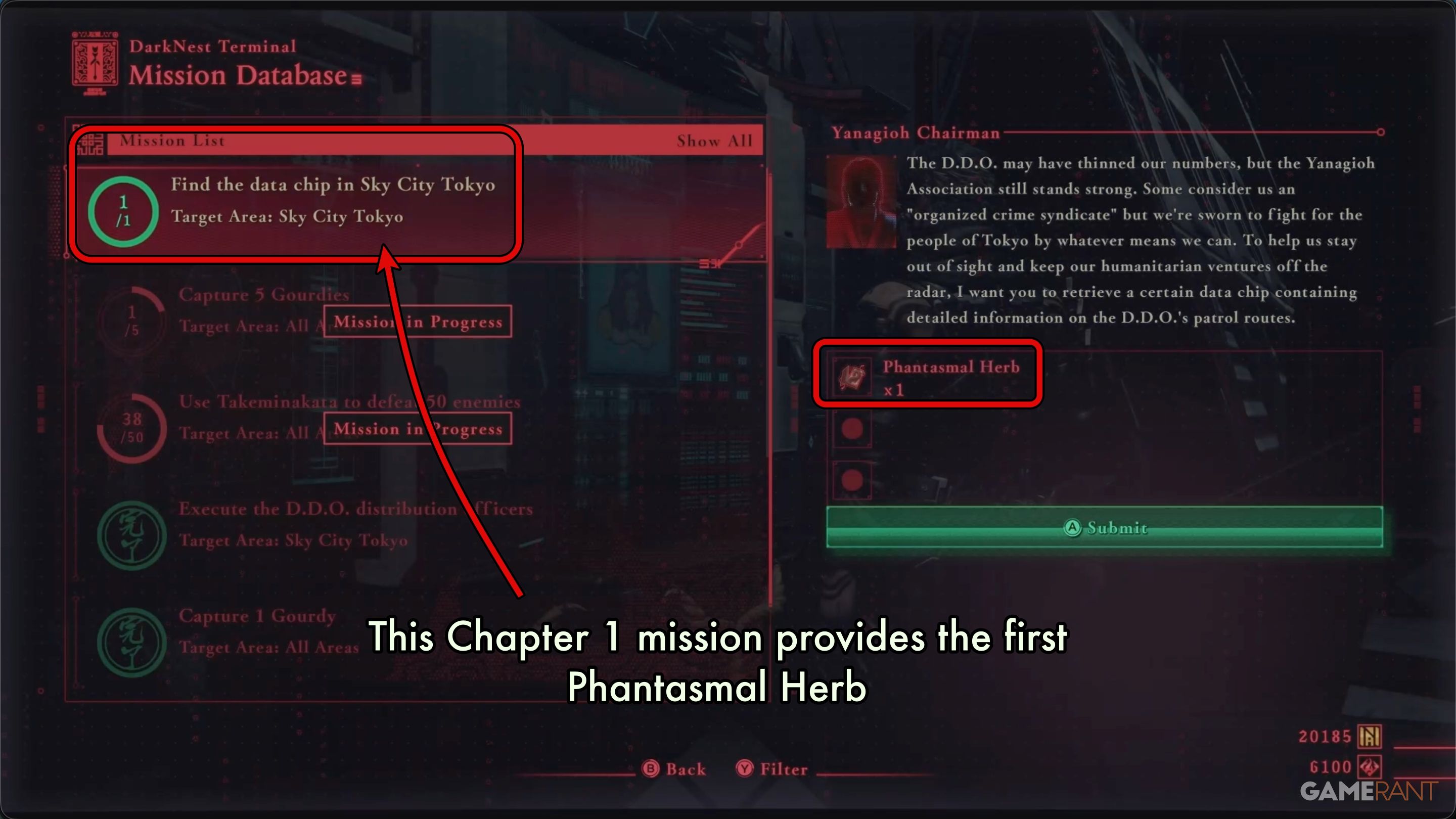 Both missions start in Sky City Tokyo. If you completed the mission from Chapter 1 – the one where you defeat 50 enemies – you can now turn it in and receive the Bulwark God’s Orb. This accessory reduces all ranged damage that Yakumo takes by half.