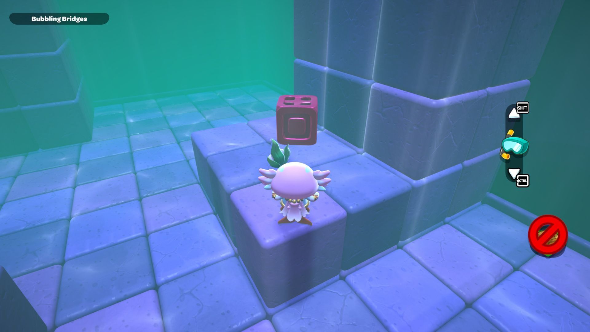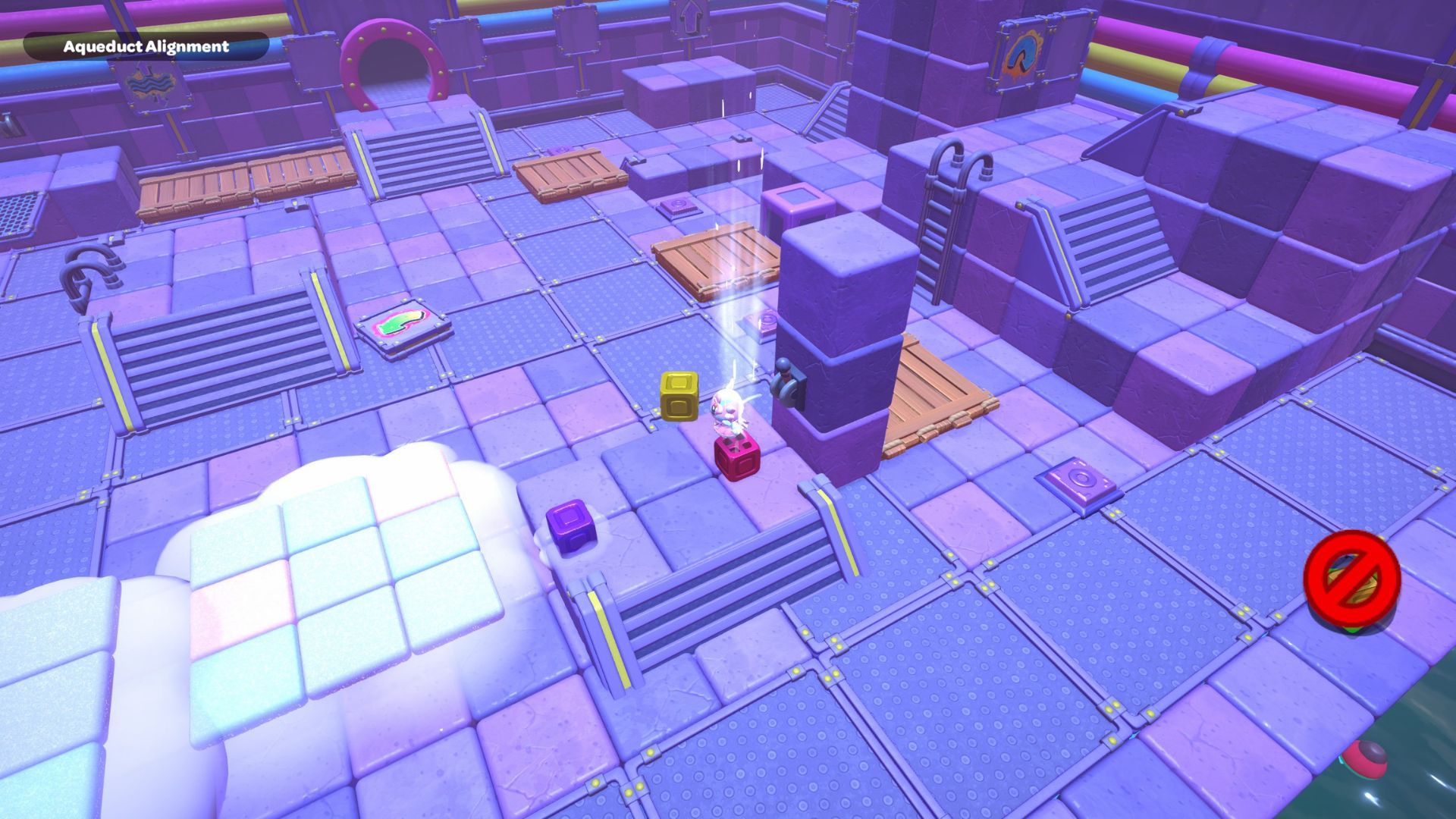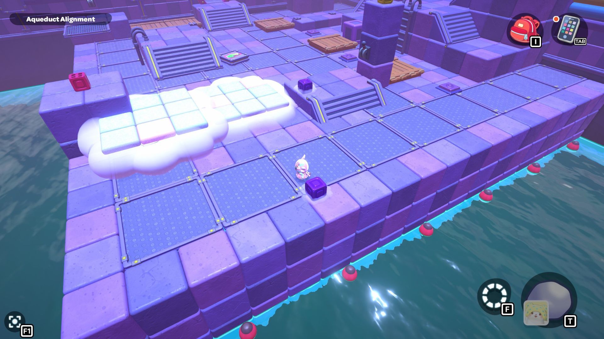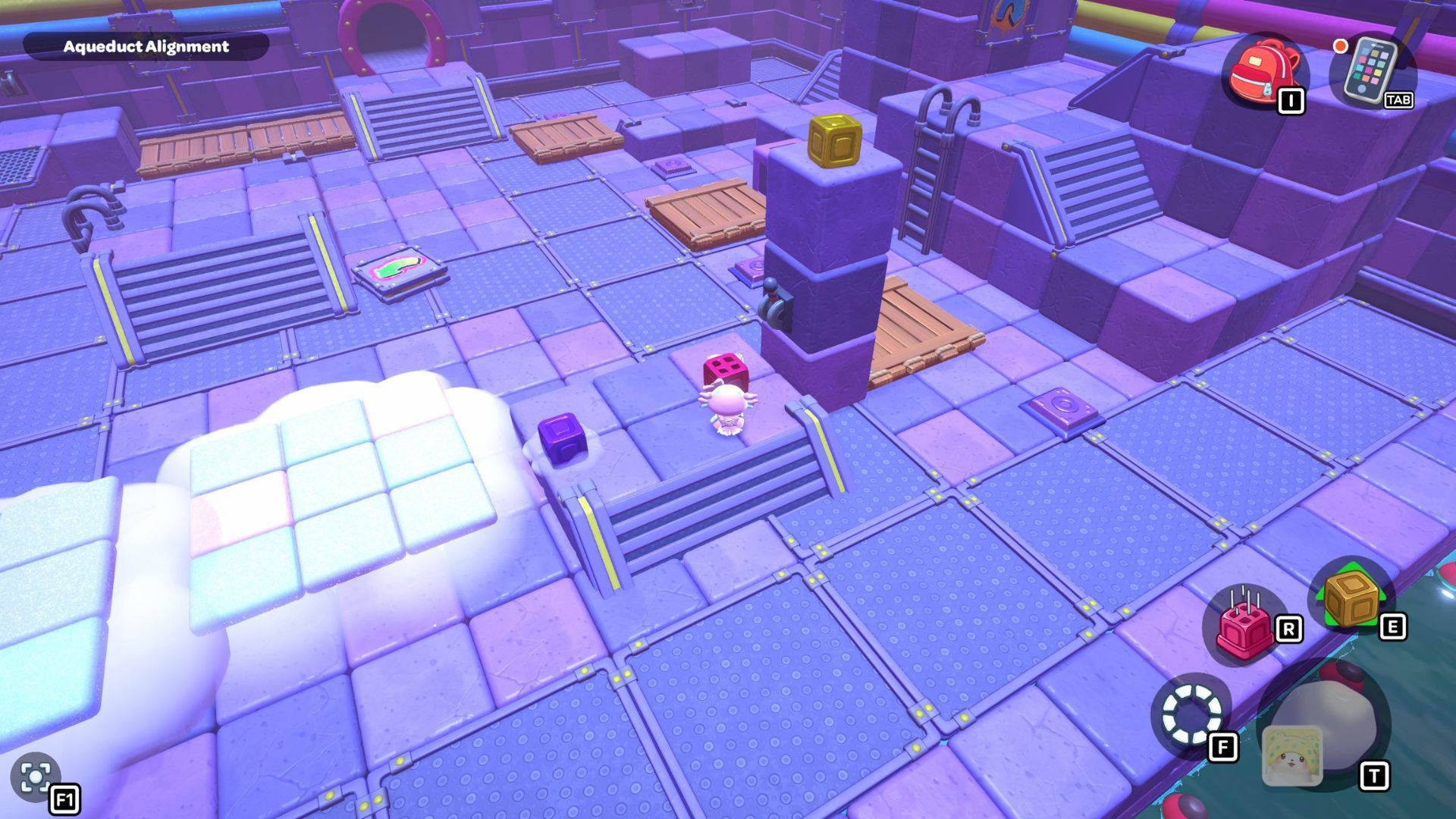 Go back to one of the levers and bring the water level down. Pick up the purple cube from the far left side and place it on the platform in the middle of the room where the lever is. Turn the cube so the cloud symbol is over the opening you made. Use the cube to build platforms for the cloud, then raise the water level once more.
